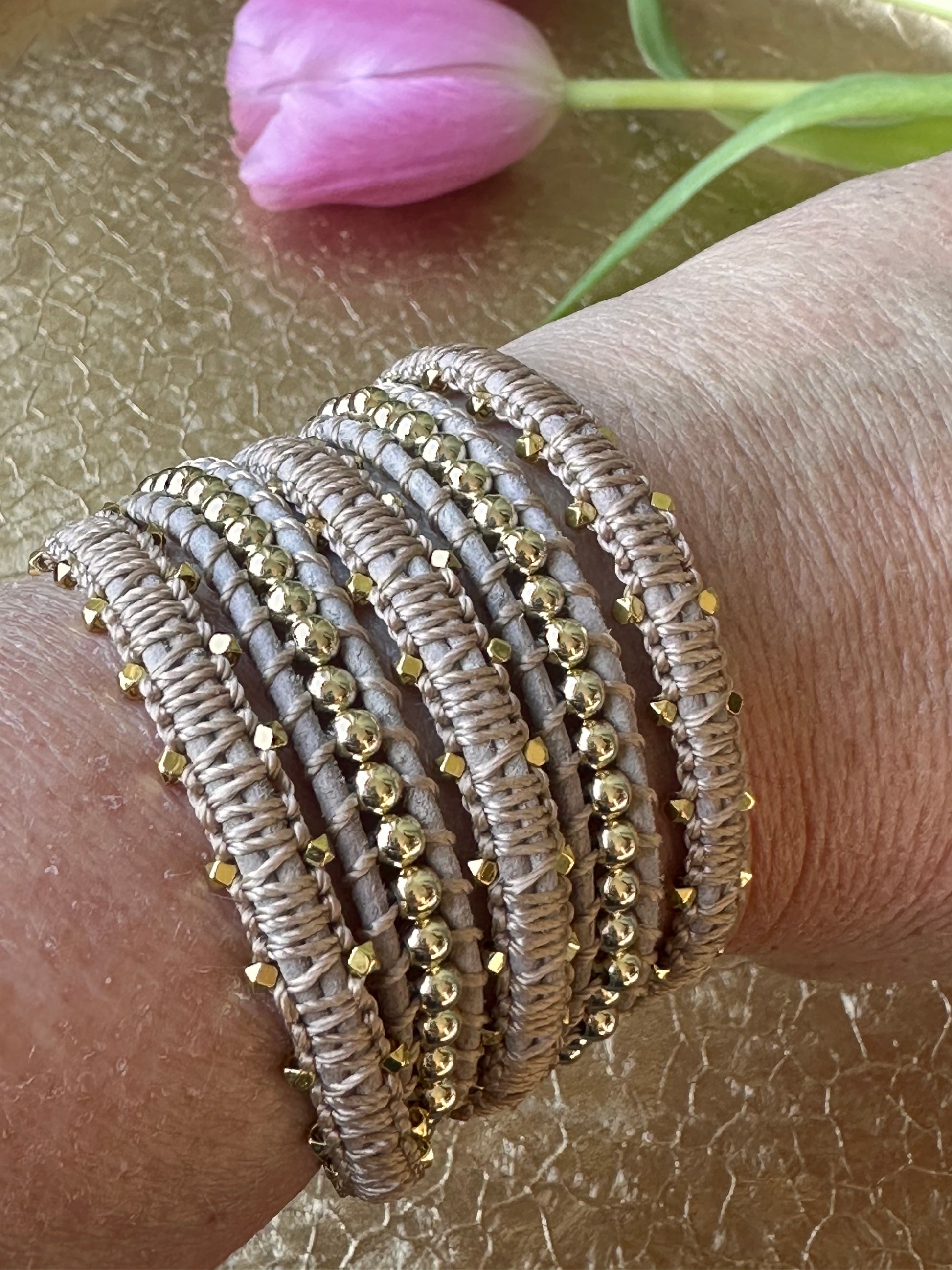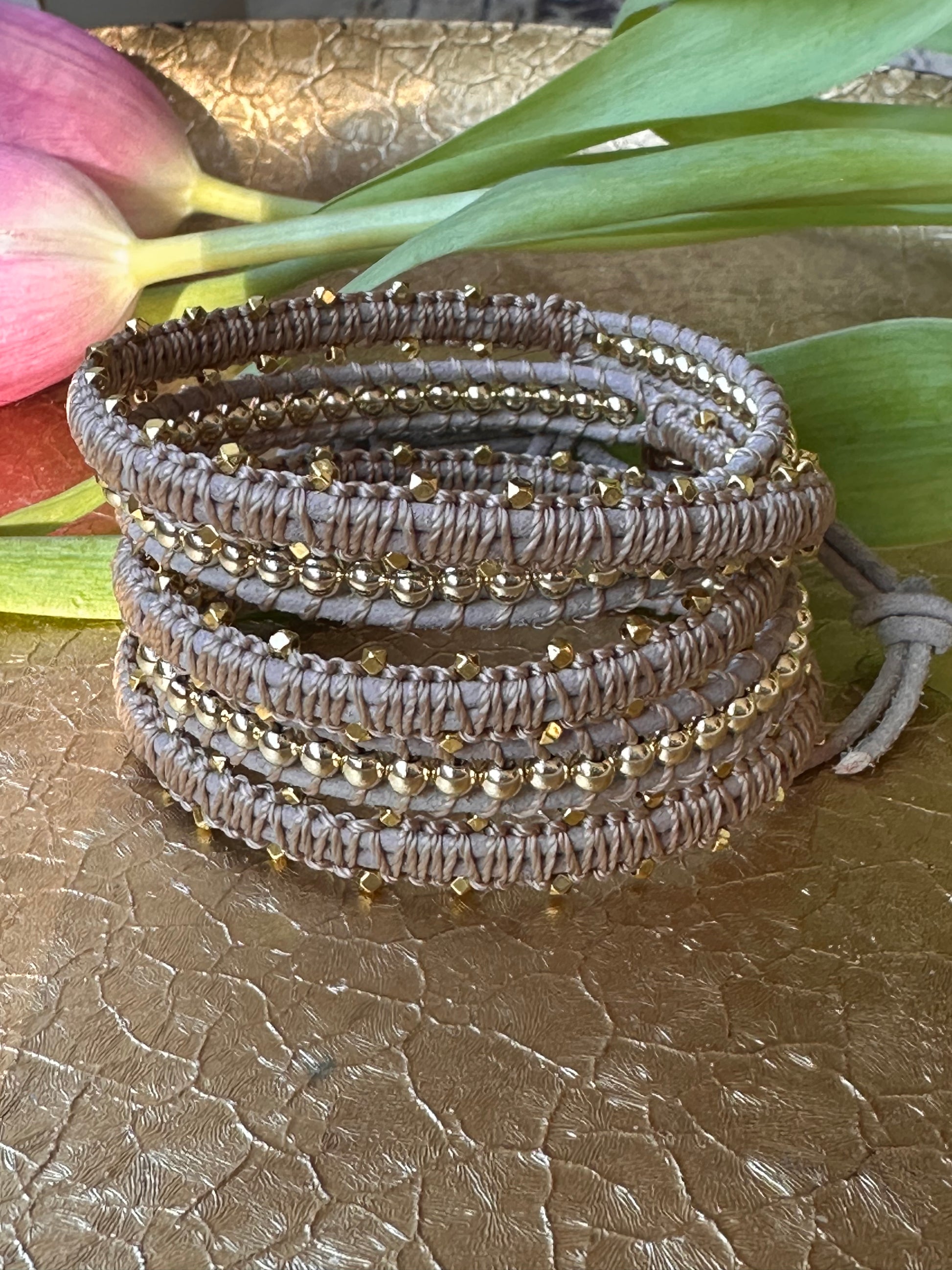 5-wrap leather bracelet, macrame with gold plated chips amd 4 mm gold filled beads, adjustable clasp
