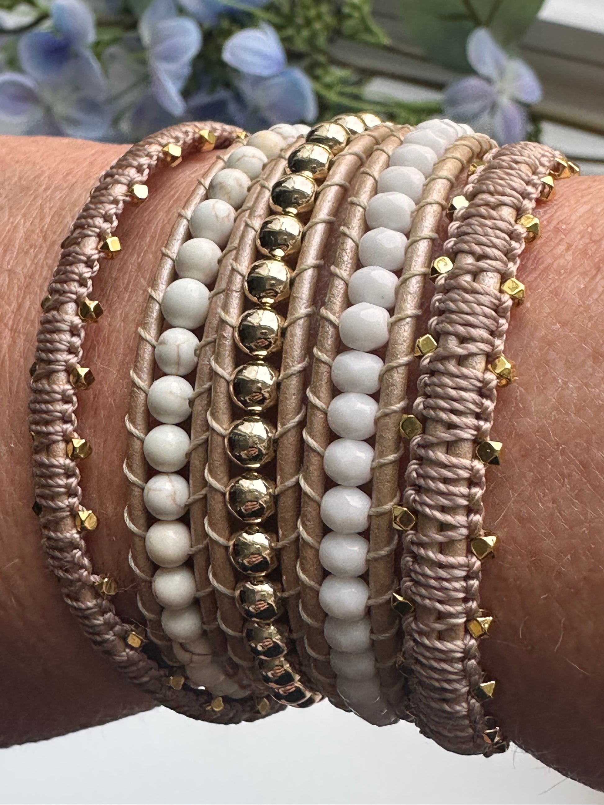 5-wrap leather bracelet with 14 ct gold filled beads , howlite and firepolished beads. Adjustable closure