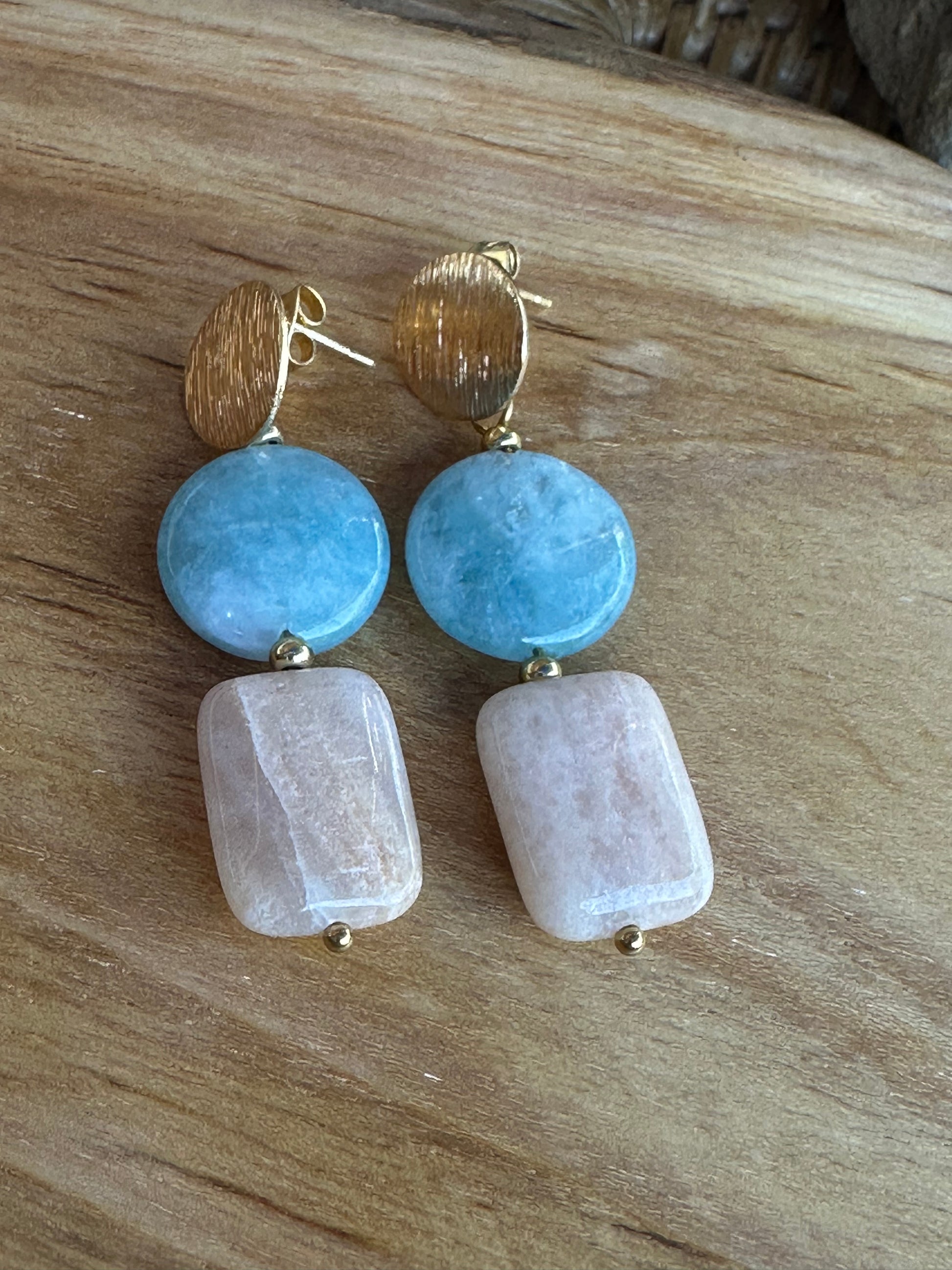 Amazonite and Calcite earring with a gold plated stud, 5 cm in length