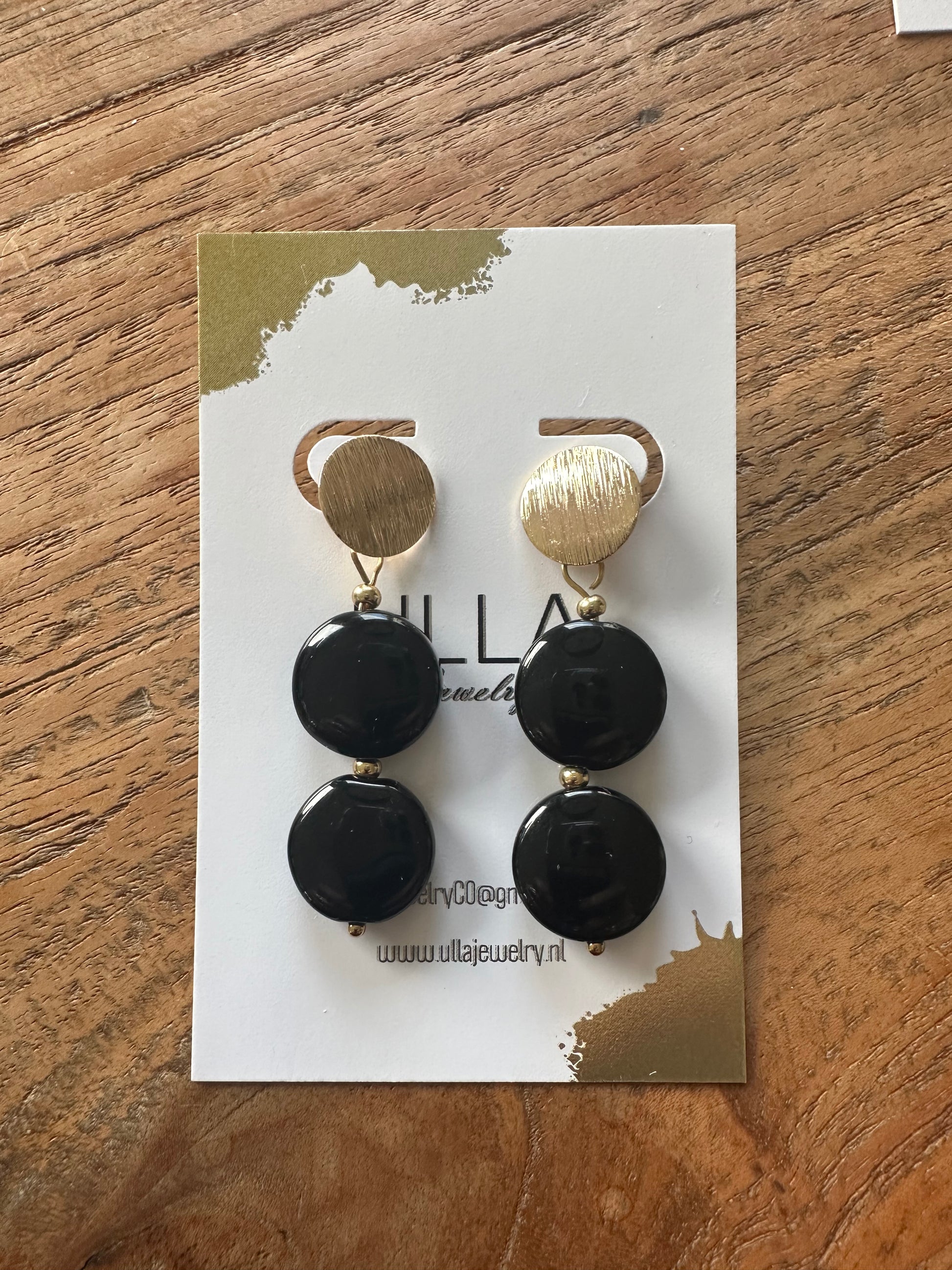 A double Onyx earring with a gold plated stud, 4,5 cm in length