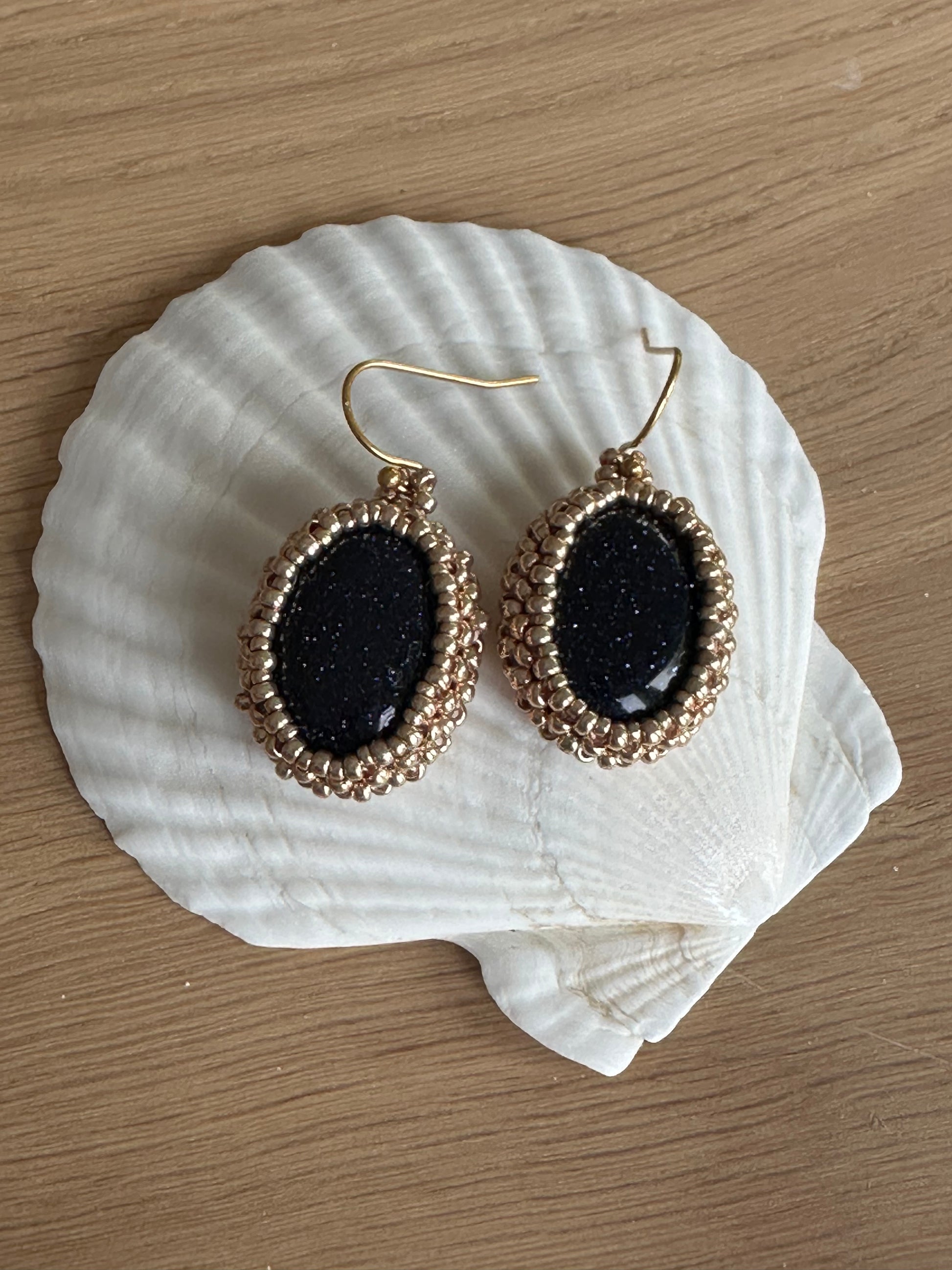 Oval Blue Sandstone Earrings with a Miyuki seed bead casing, 3 cm in length.