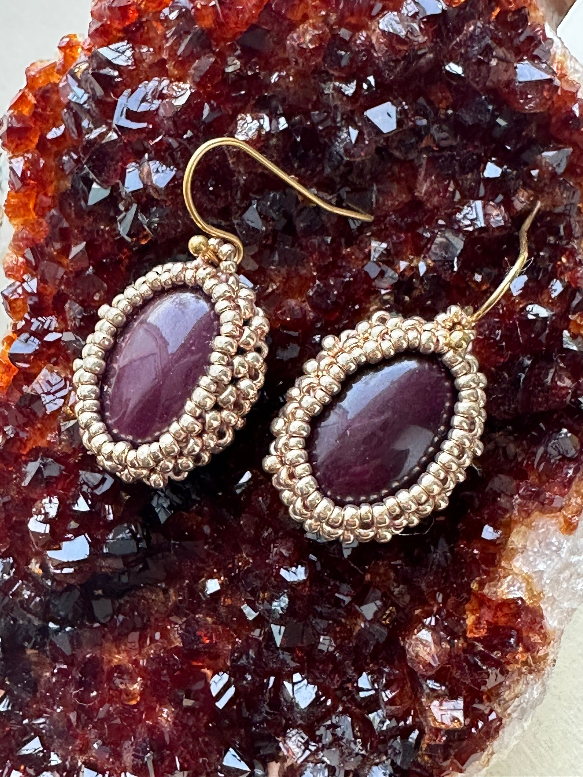 Oval Brown red Jade Earrings with a Miyuki seed bead casing, 2,5 cm in length.