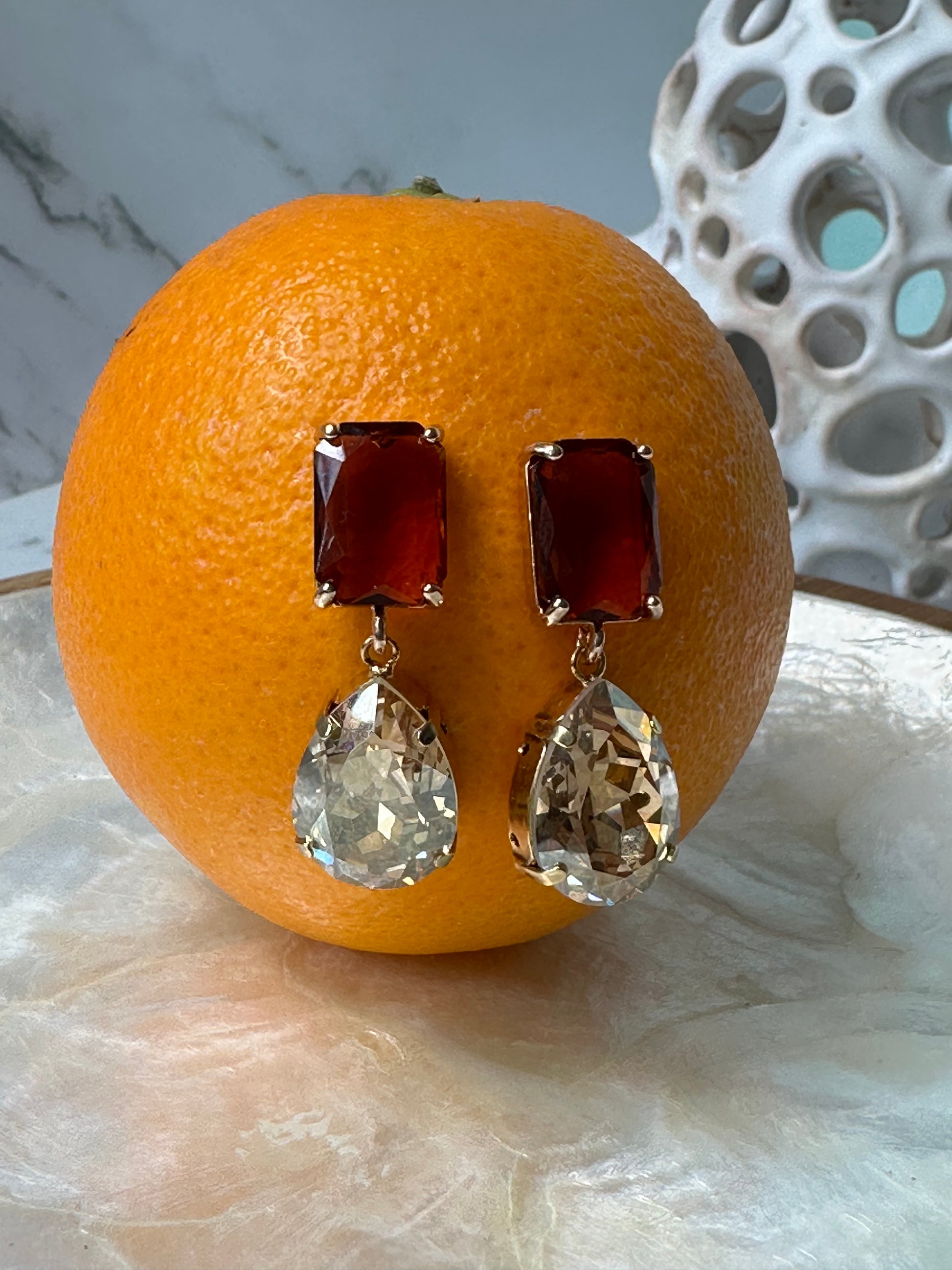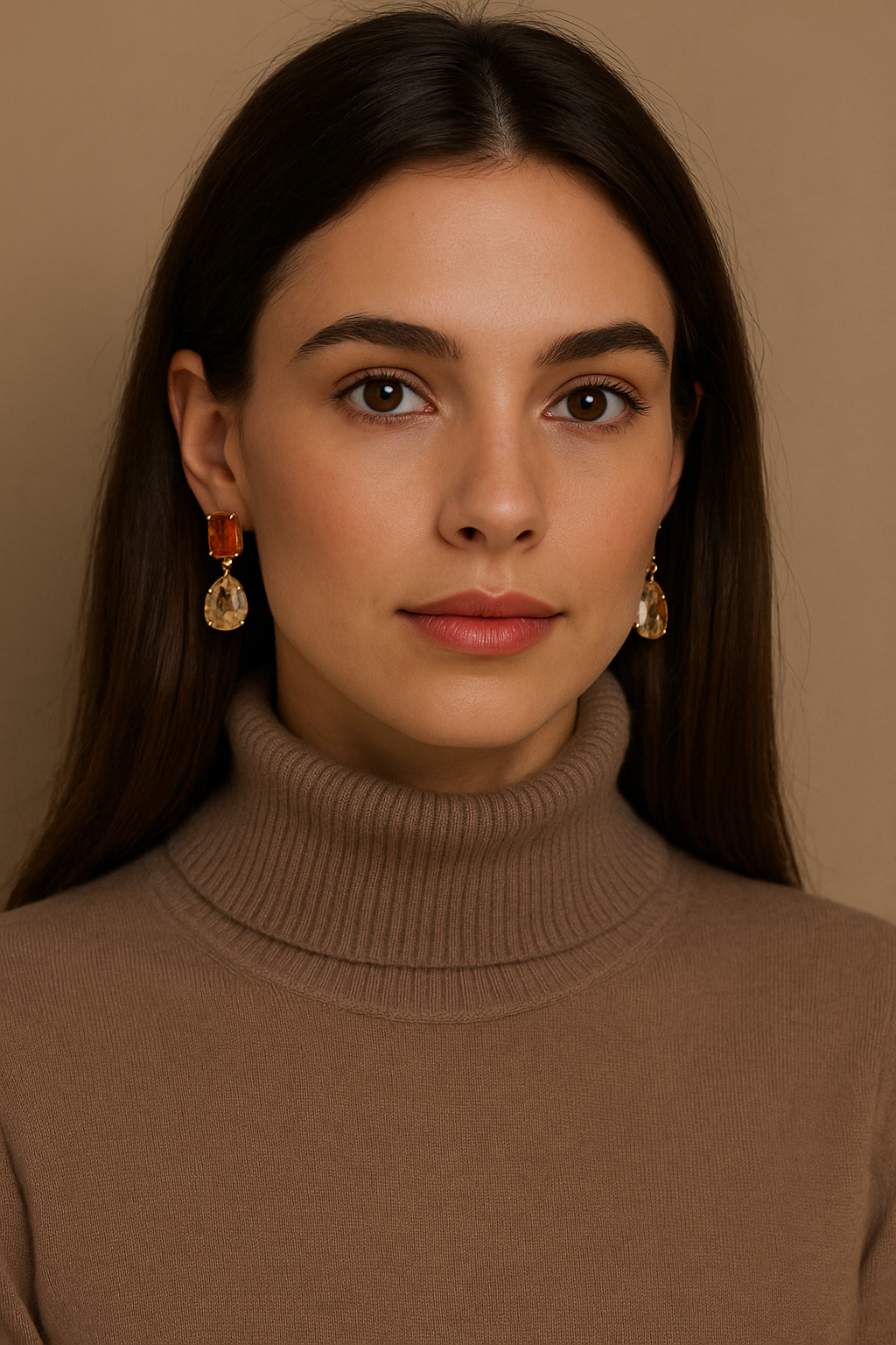 Caramel and champagne colored crystal earrings, 3,5 cm in length. Model image created with AI