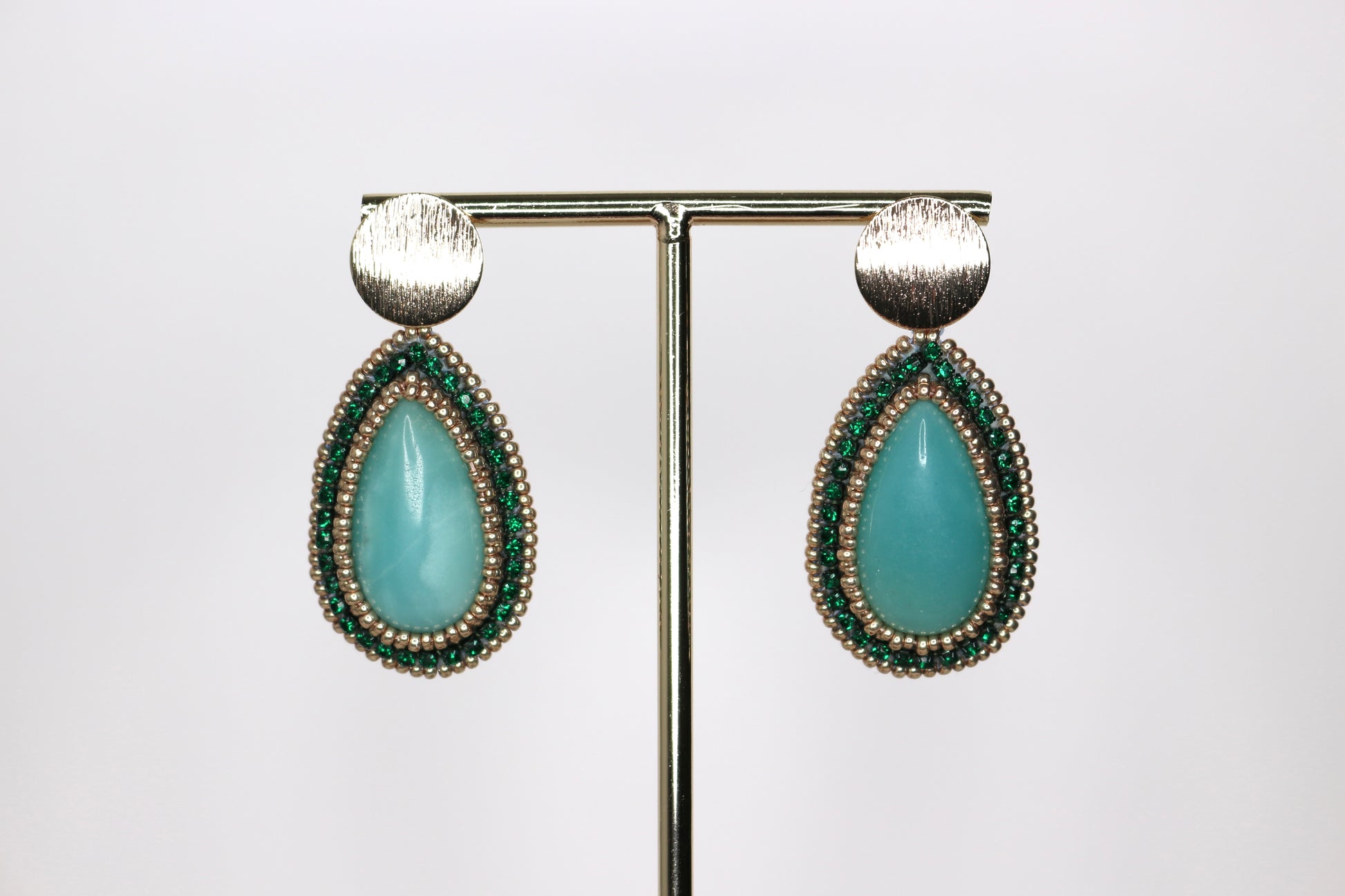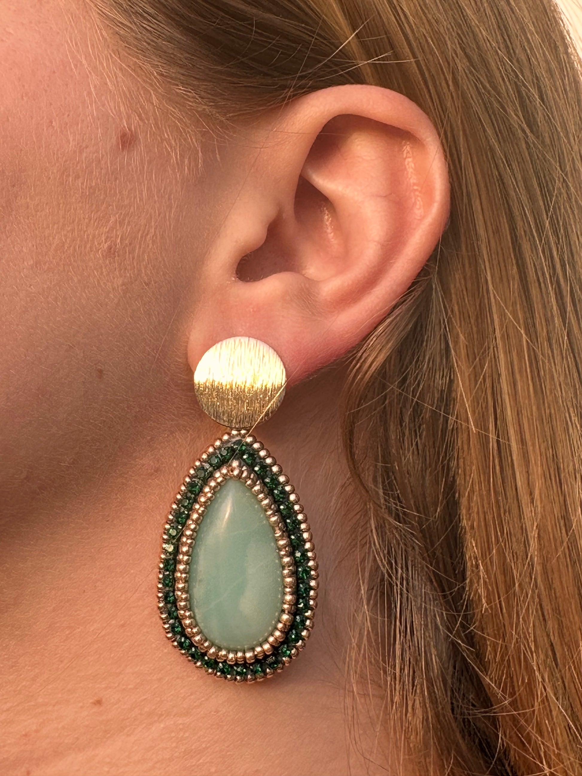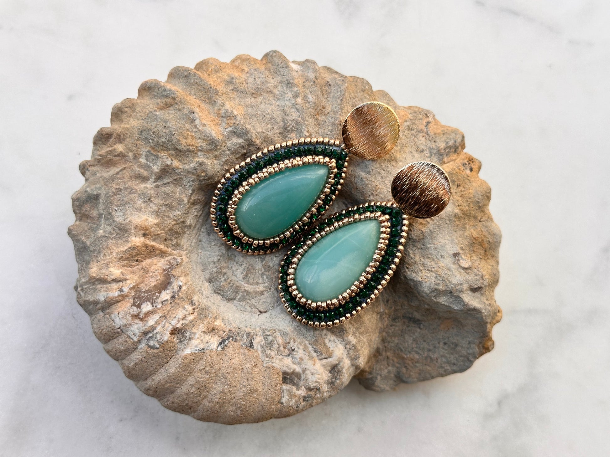An elongated gemstone teardrop earring with green and gold accents, 5,5 cm in length