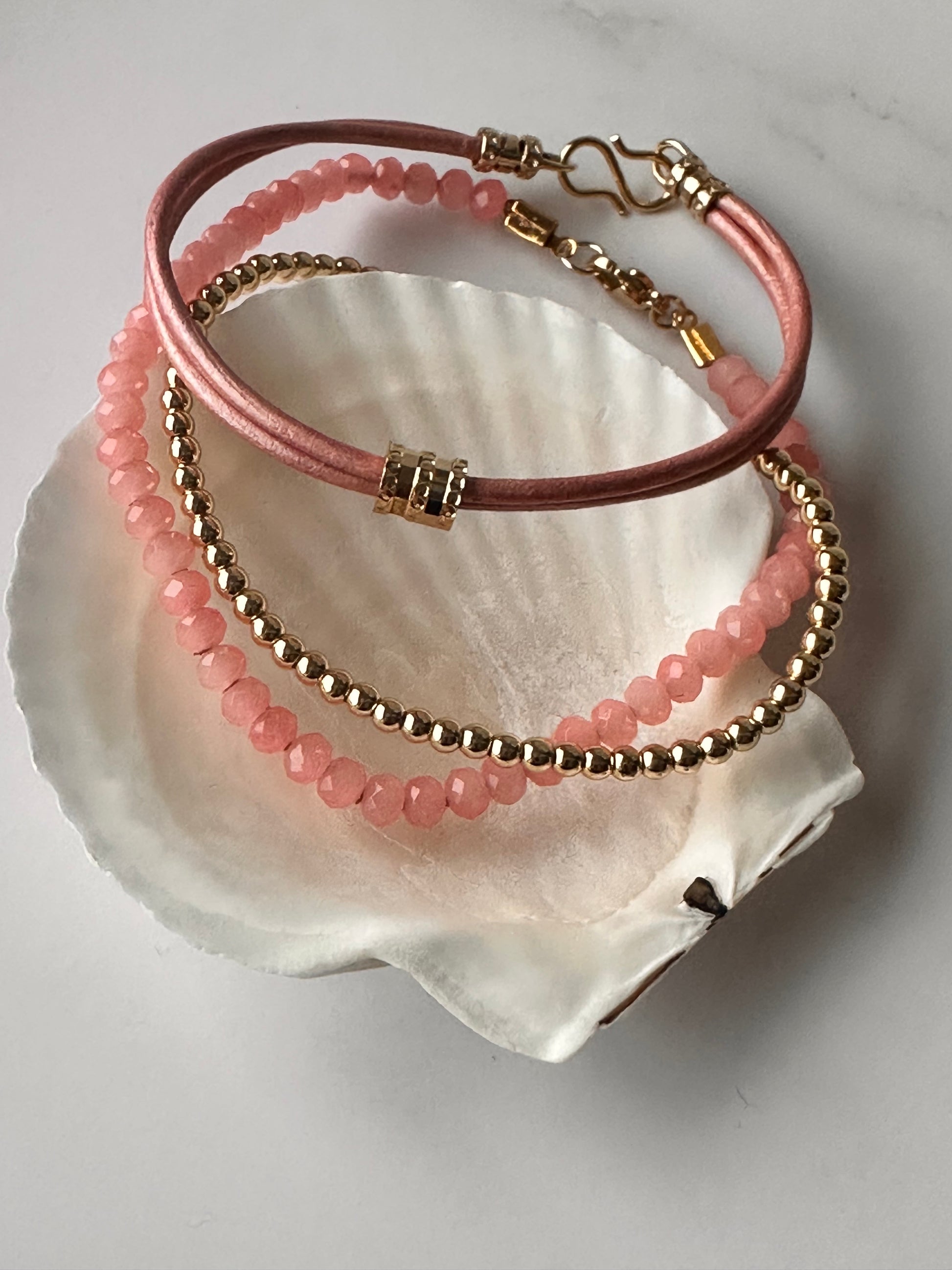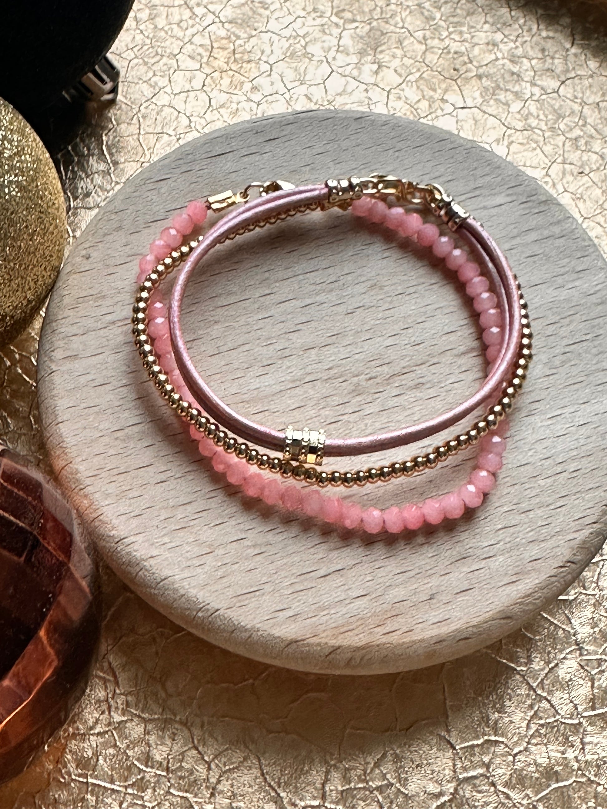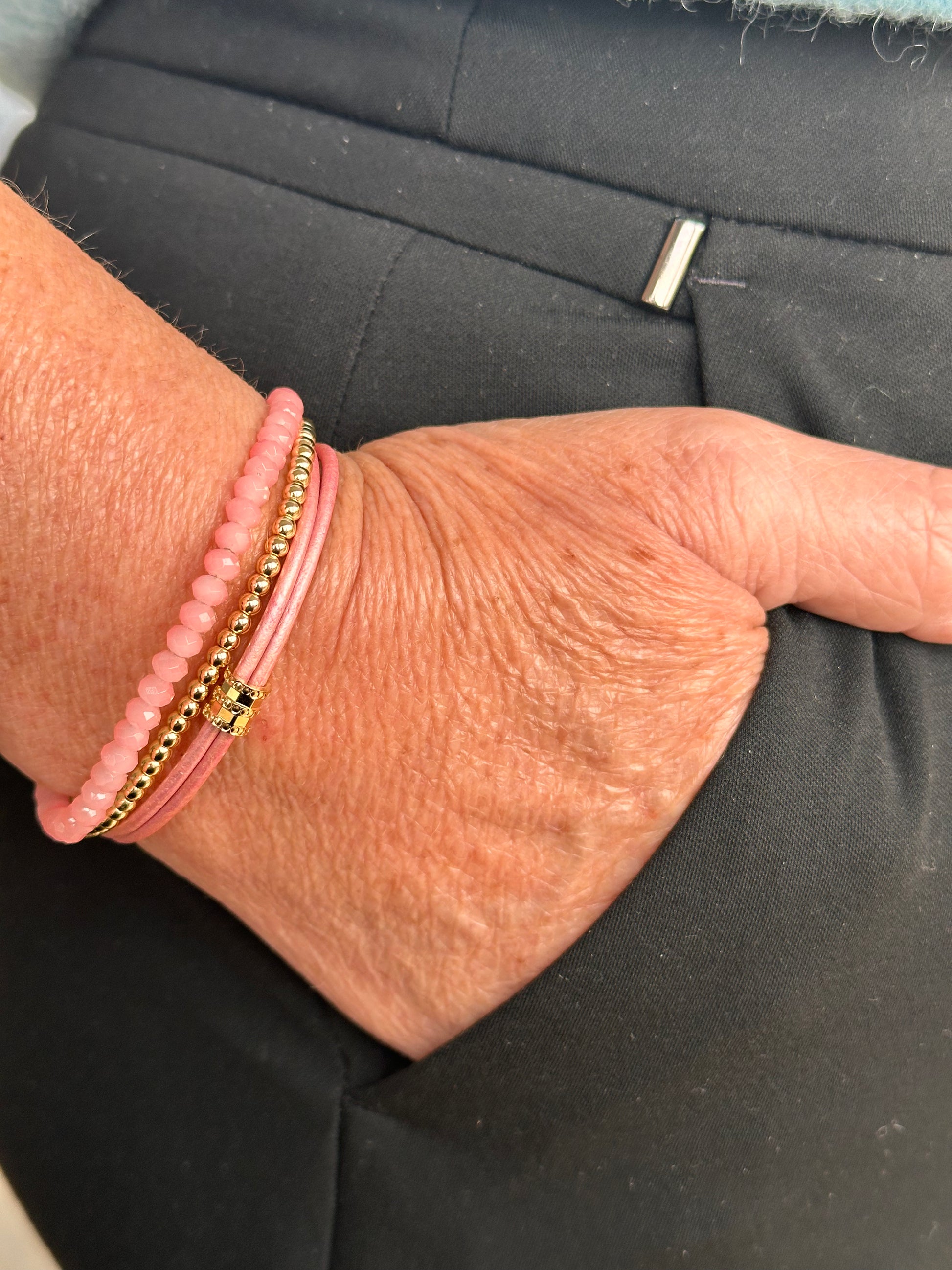A stack of three bracelets; a double leather bracelet with 24 kt gold plated accents, a pink crystal bracelet with a 24 kt gold plated lobster claw clasp and a single bracelet with 18kt gold plated round beads. Can also be worn separately. 18 cm