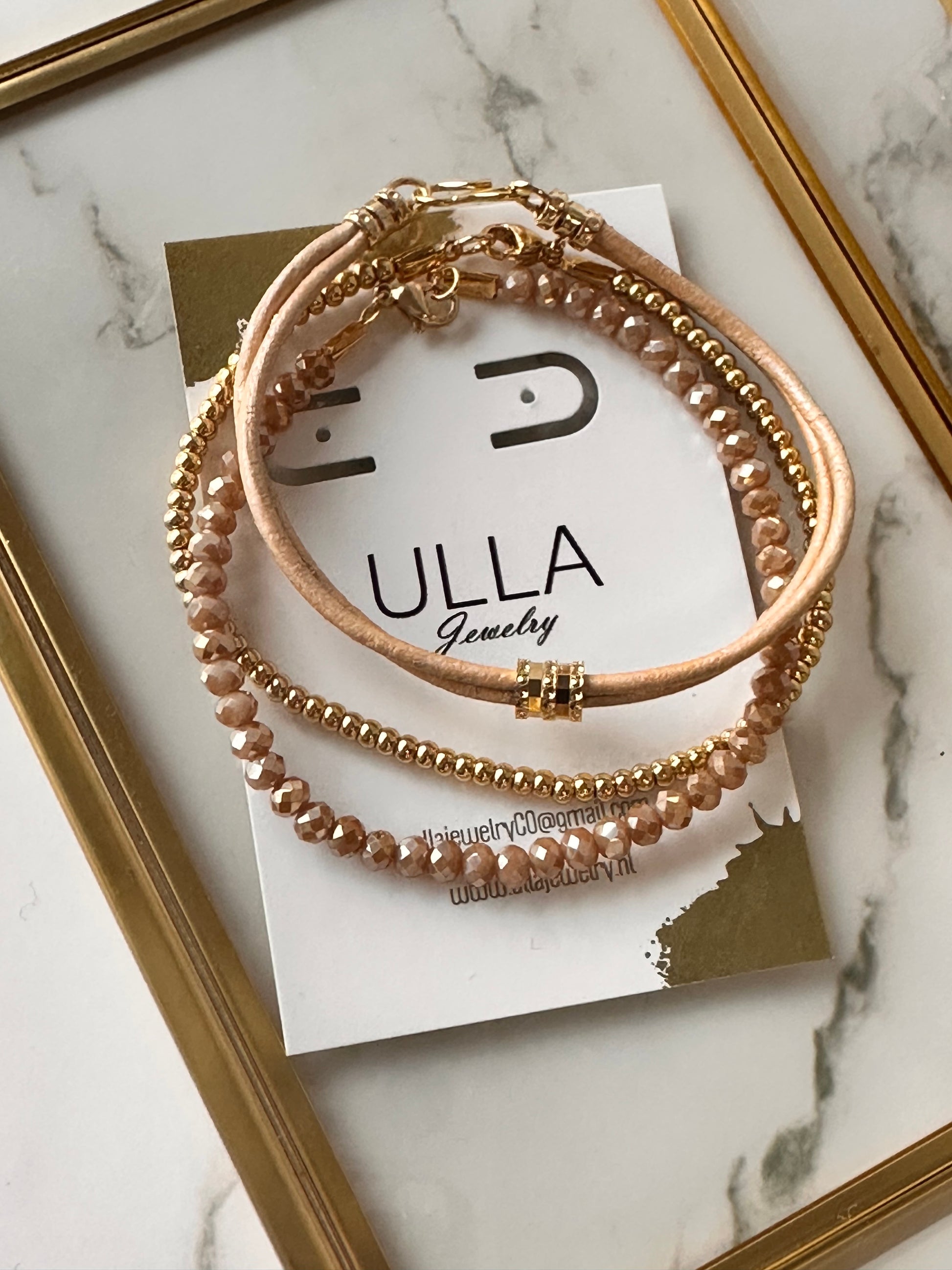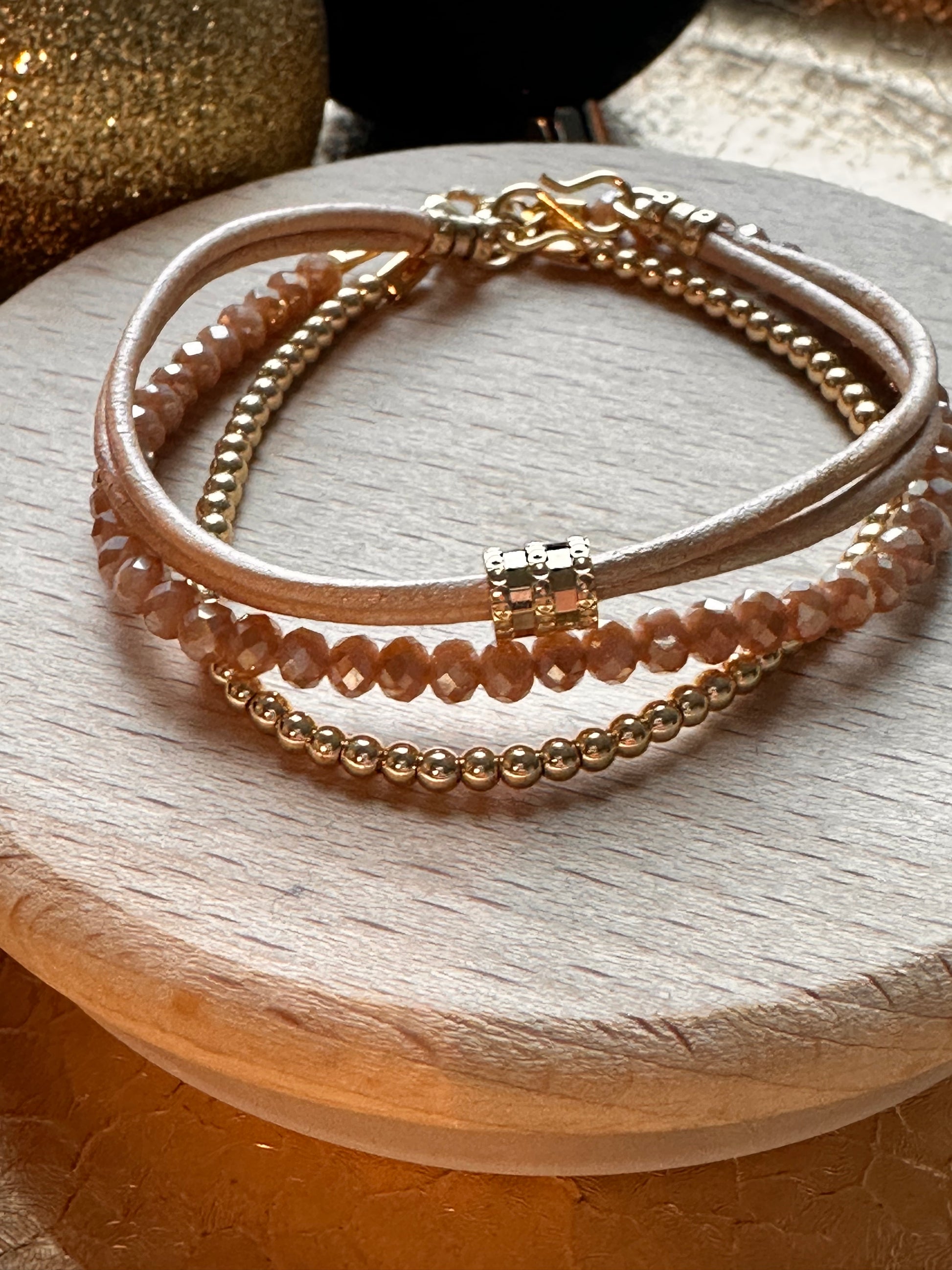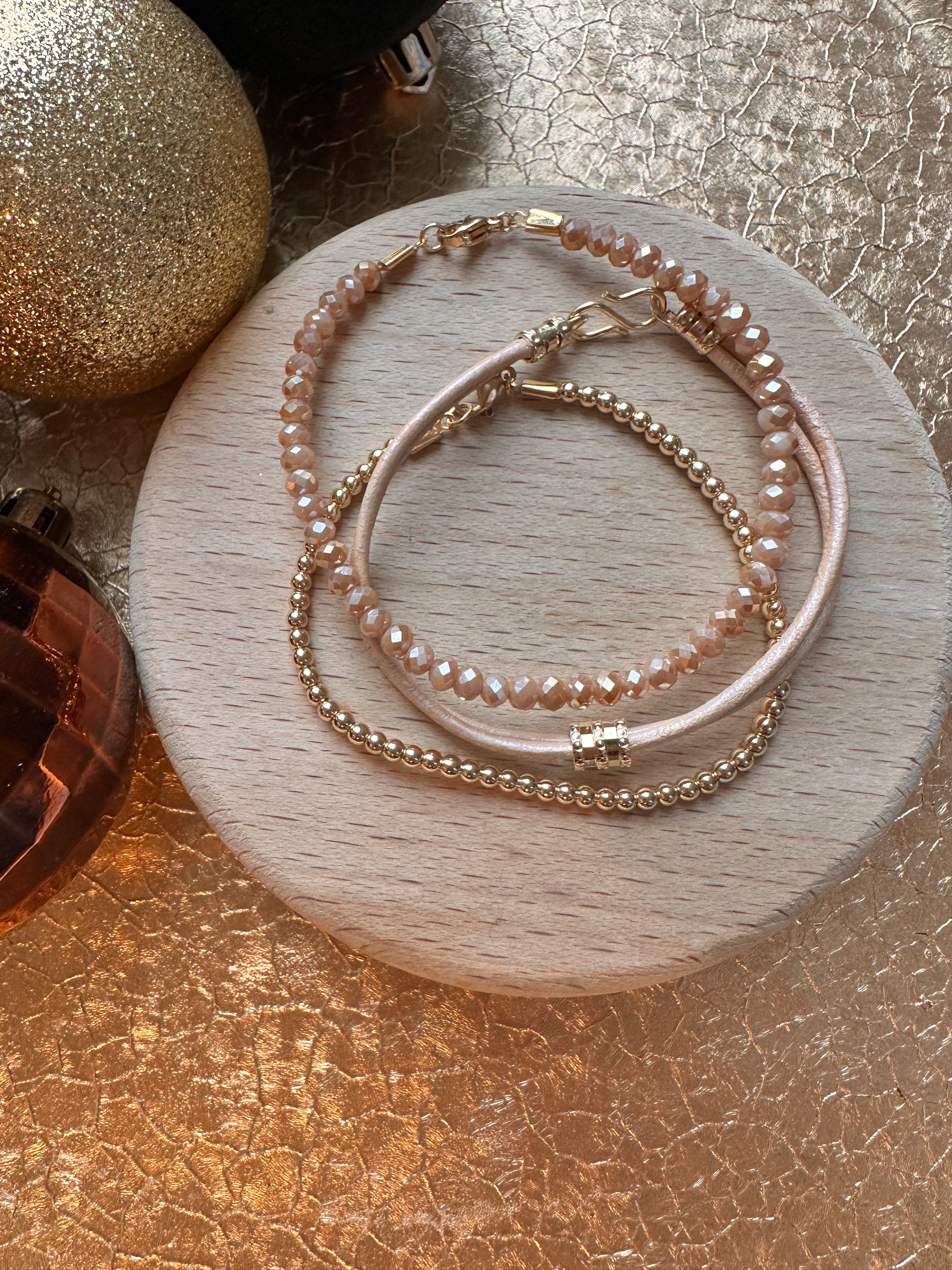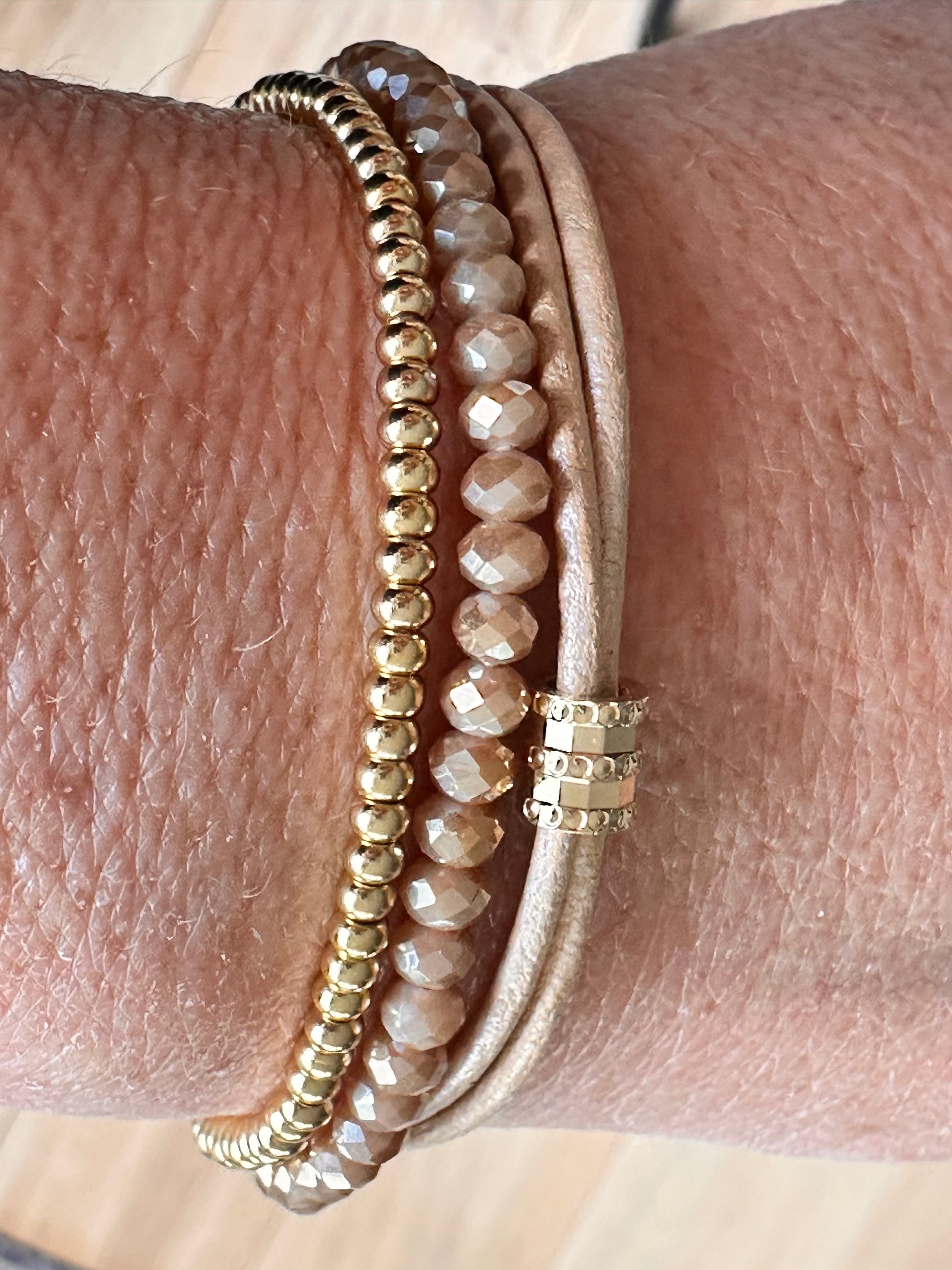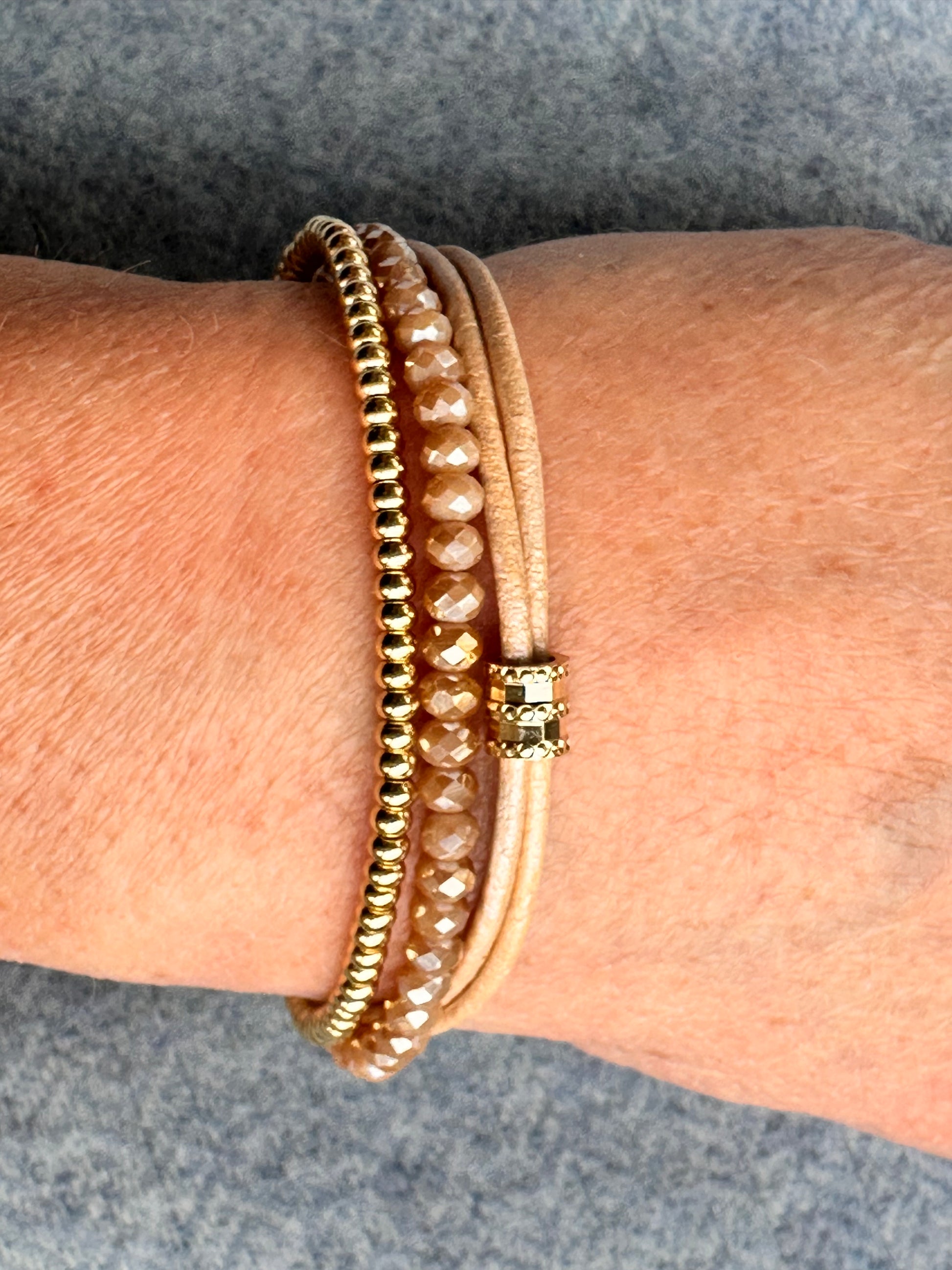 A stack of three bracelets; a double leather bangle with 24 kt gold plated accents, a beige crystal bracelet with a 24 kt gold plated lobster claw clasp and a single bracelet with 18 kt gold plated round beads. Can also be worn separately. 18 cm