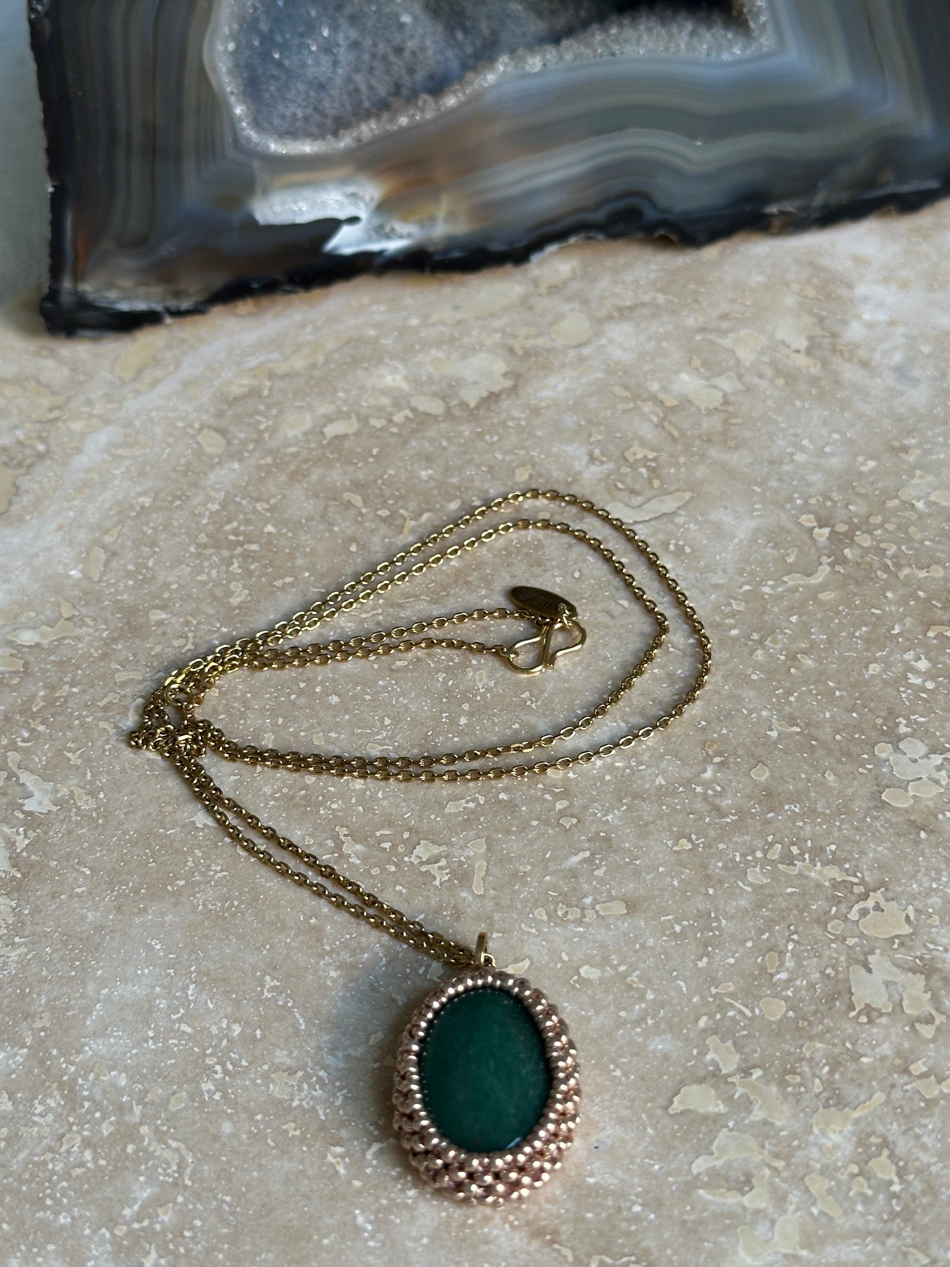 Green Chalcedony Gemstone Pendant, 3cm in length, Stainless steel 18ct gold plated chain that can be worn at 70 cm and 80 length.