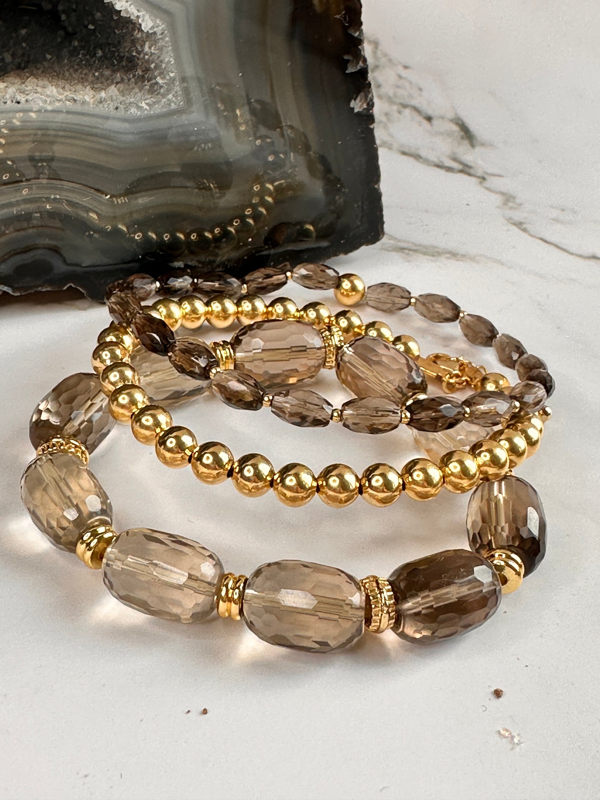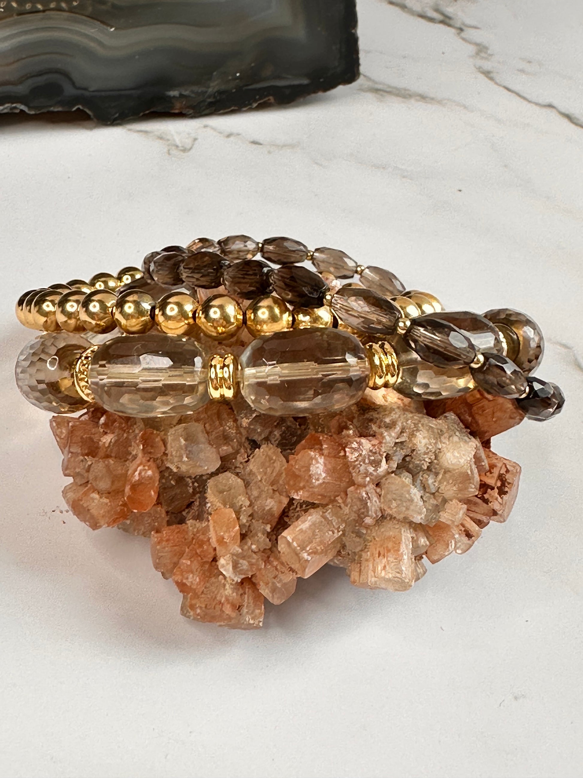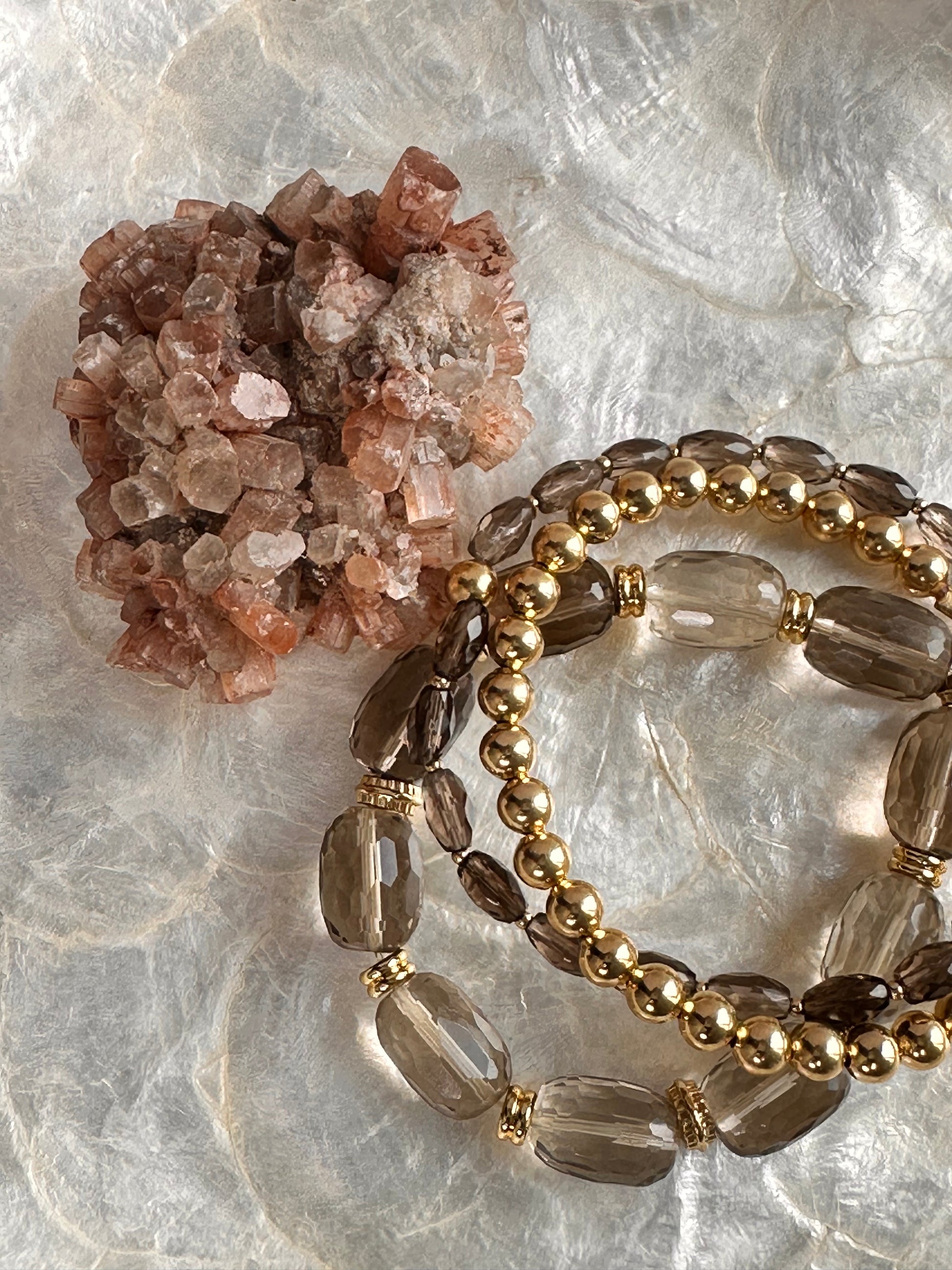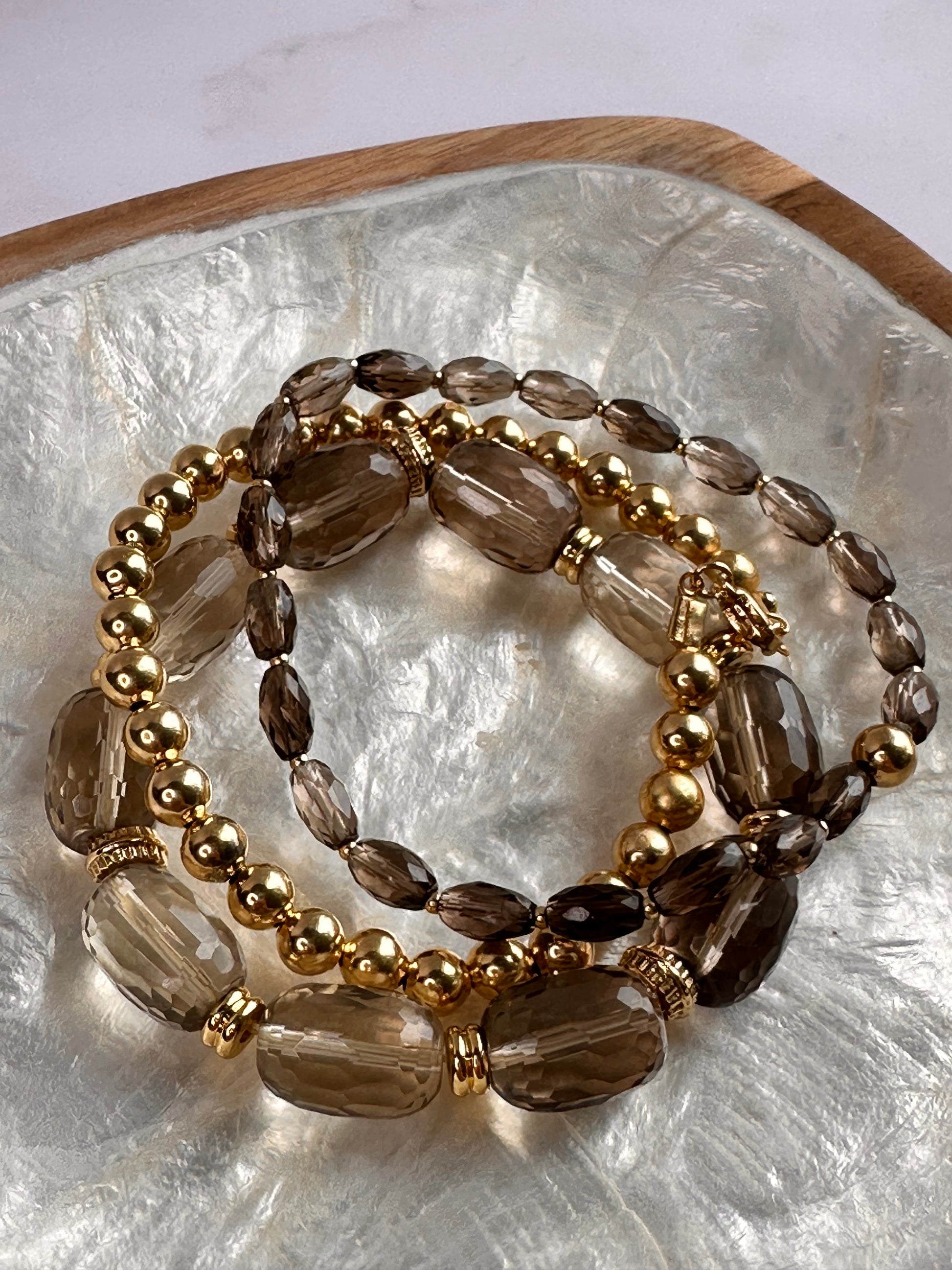 A stack of three bracelets. Two different smoky quartz bracelets with gold plated details and a single bracelet with 6 mm gold plated beads. Made as a set but can be worn individually.