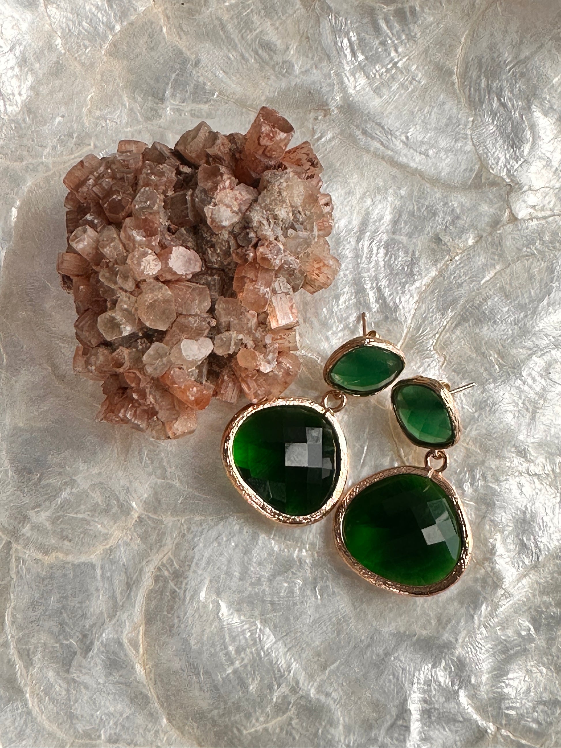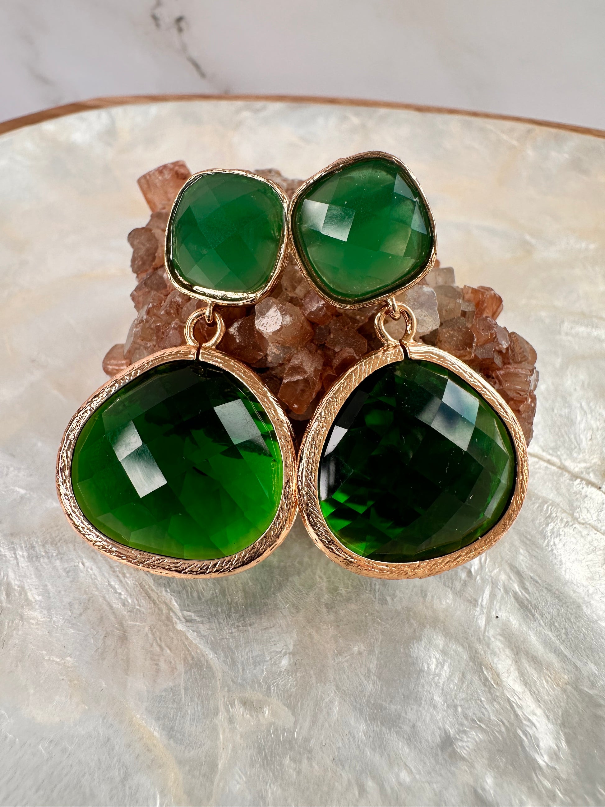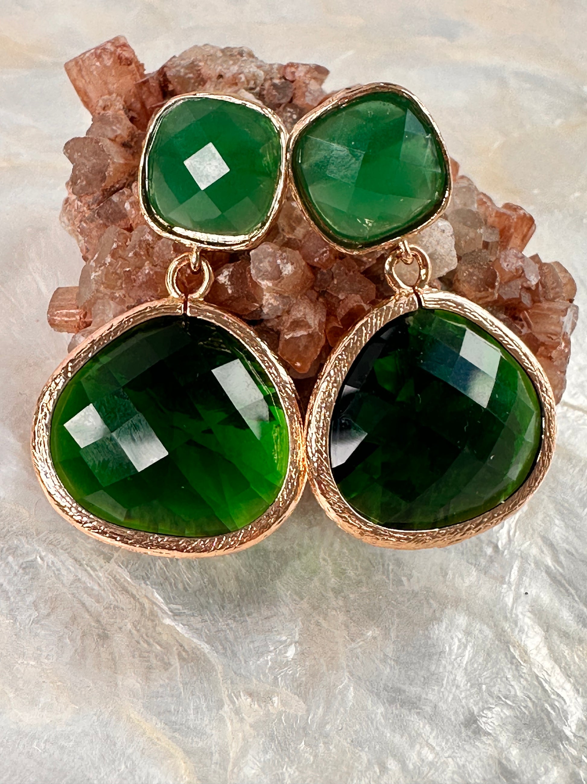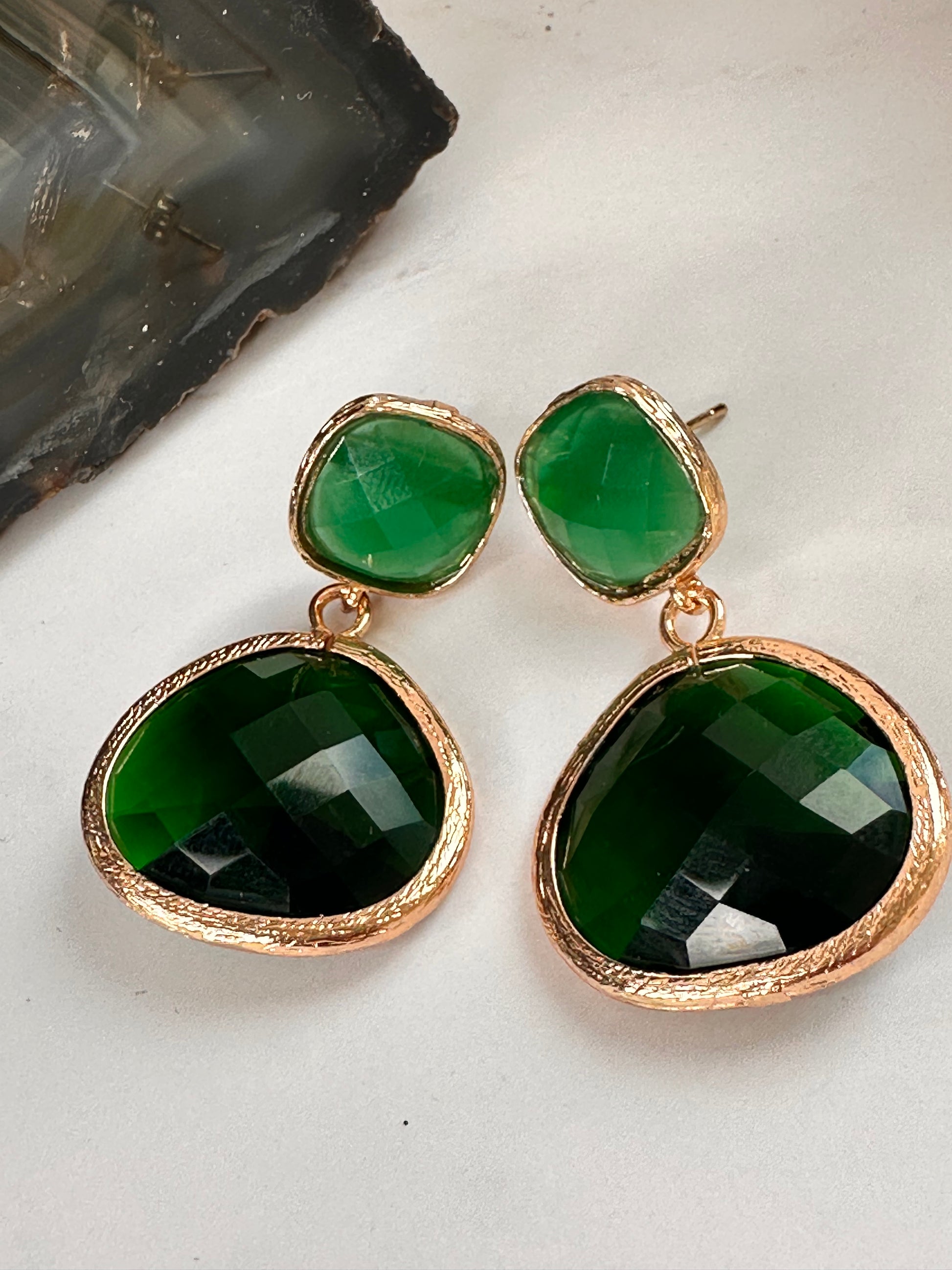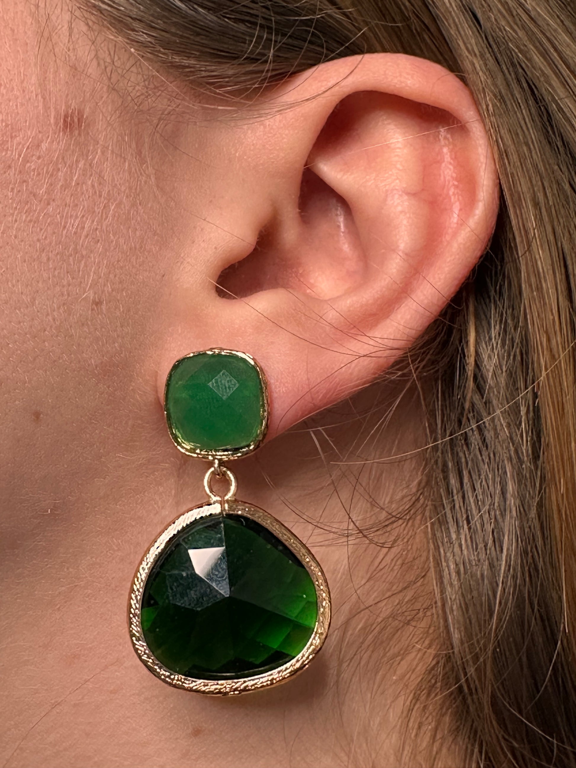 Green faceted glass earrings. 4 cm in length
