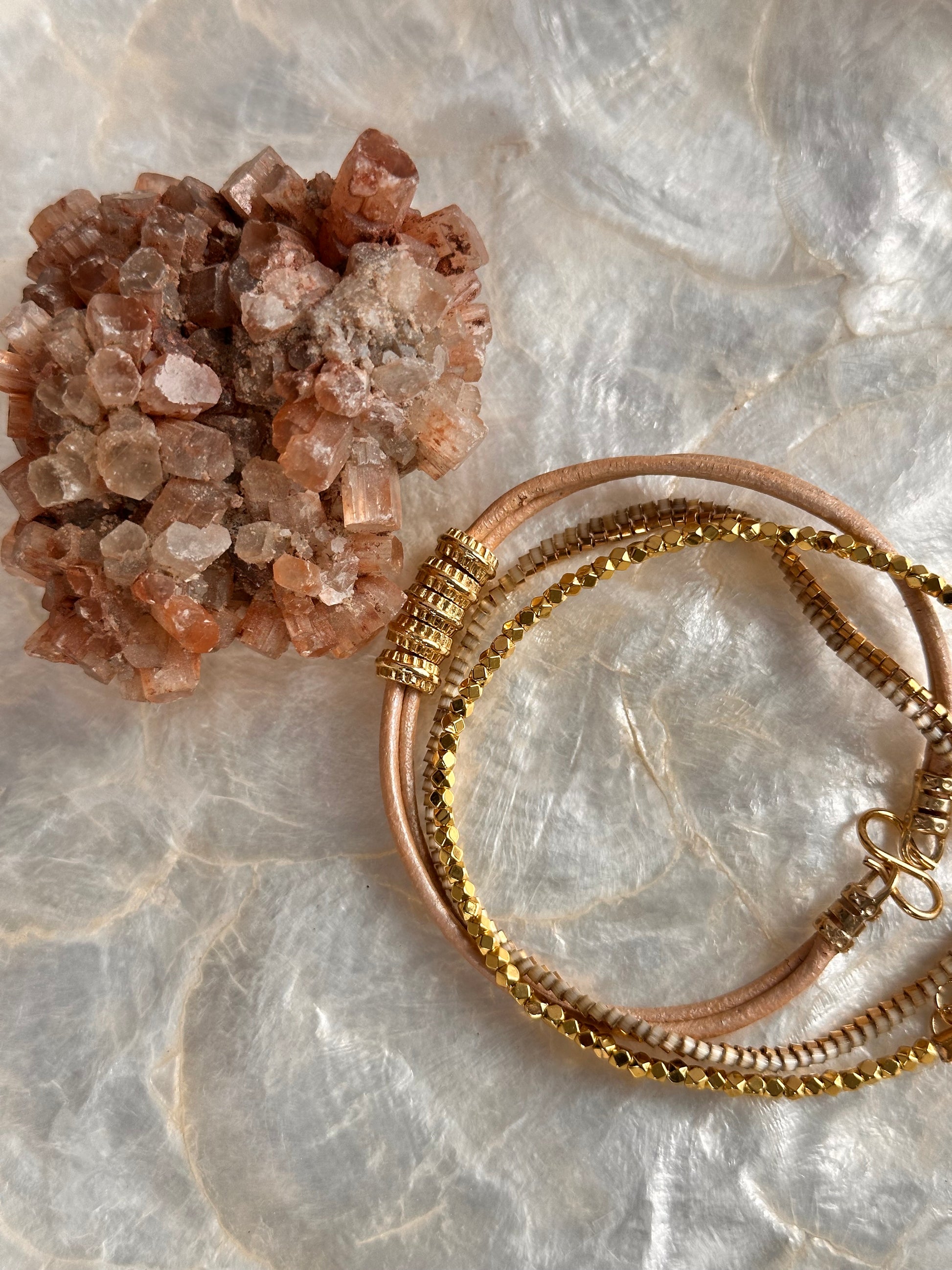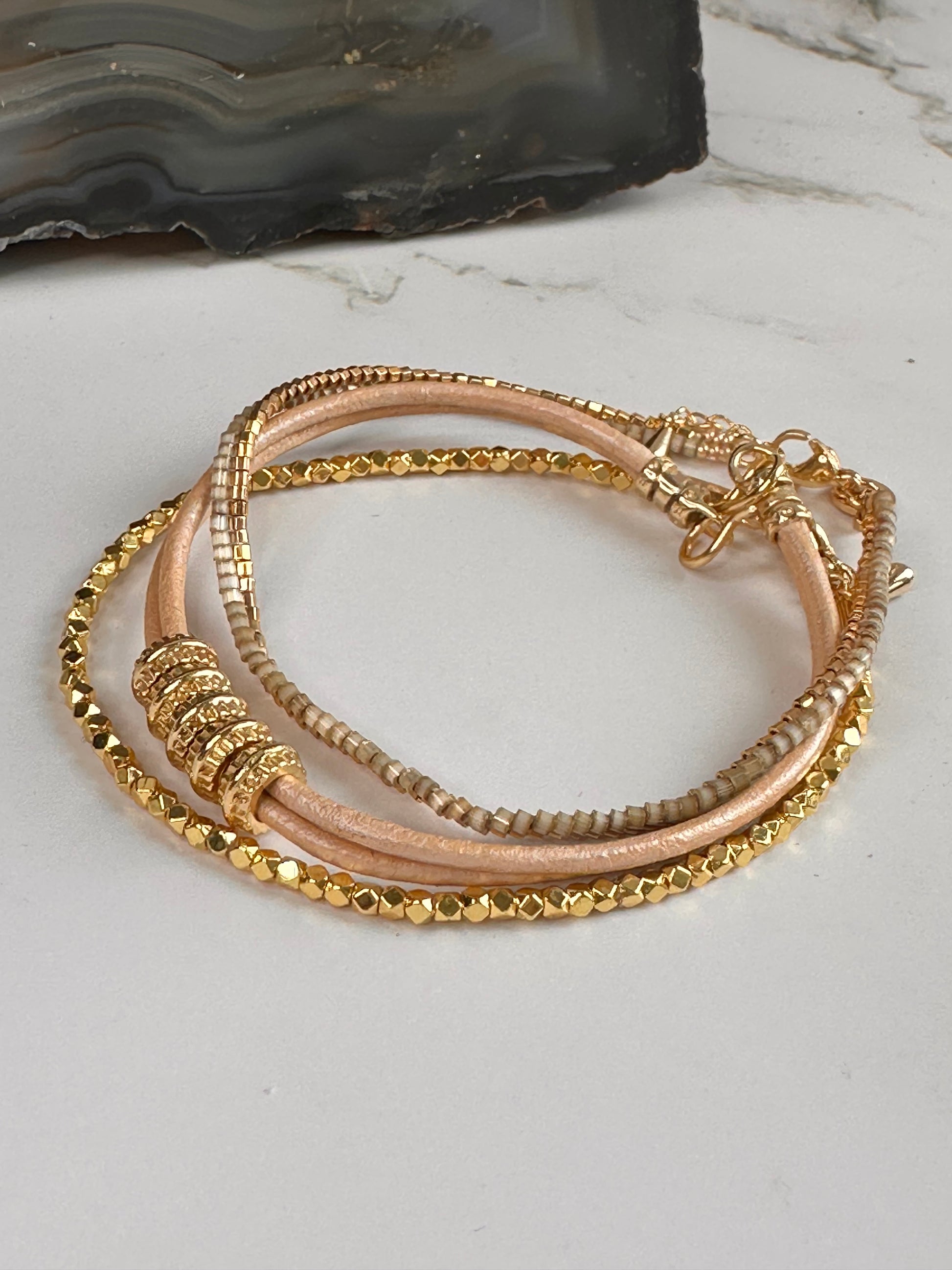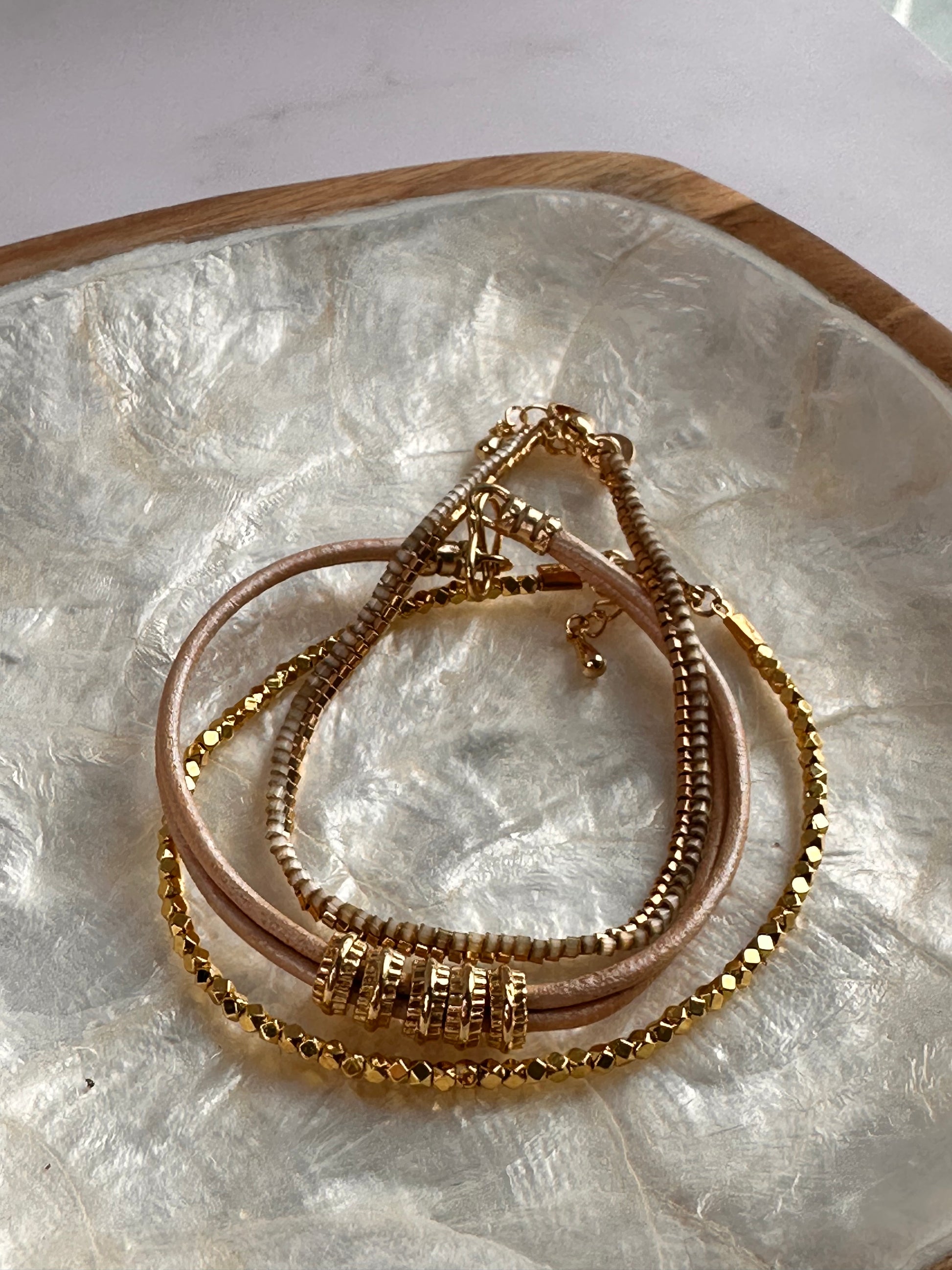 A stack of three bracelets. A beige double leather bracelet with gold plated details, a single herringbone bracelet with taupe and 24kt gold plated Miyuki Delica beads and a single bracelet with faceted gold plated beads. can all be worn individually