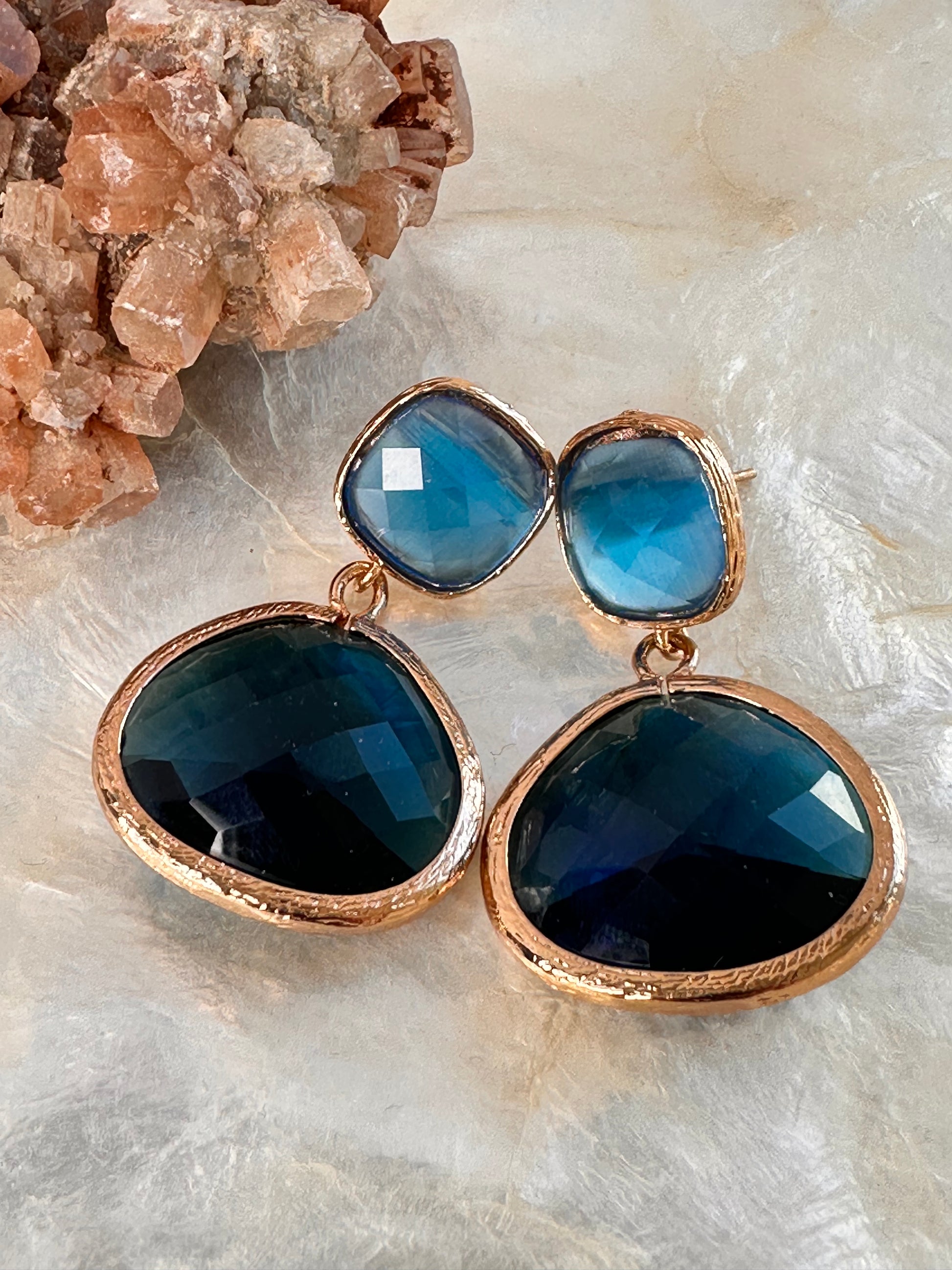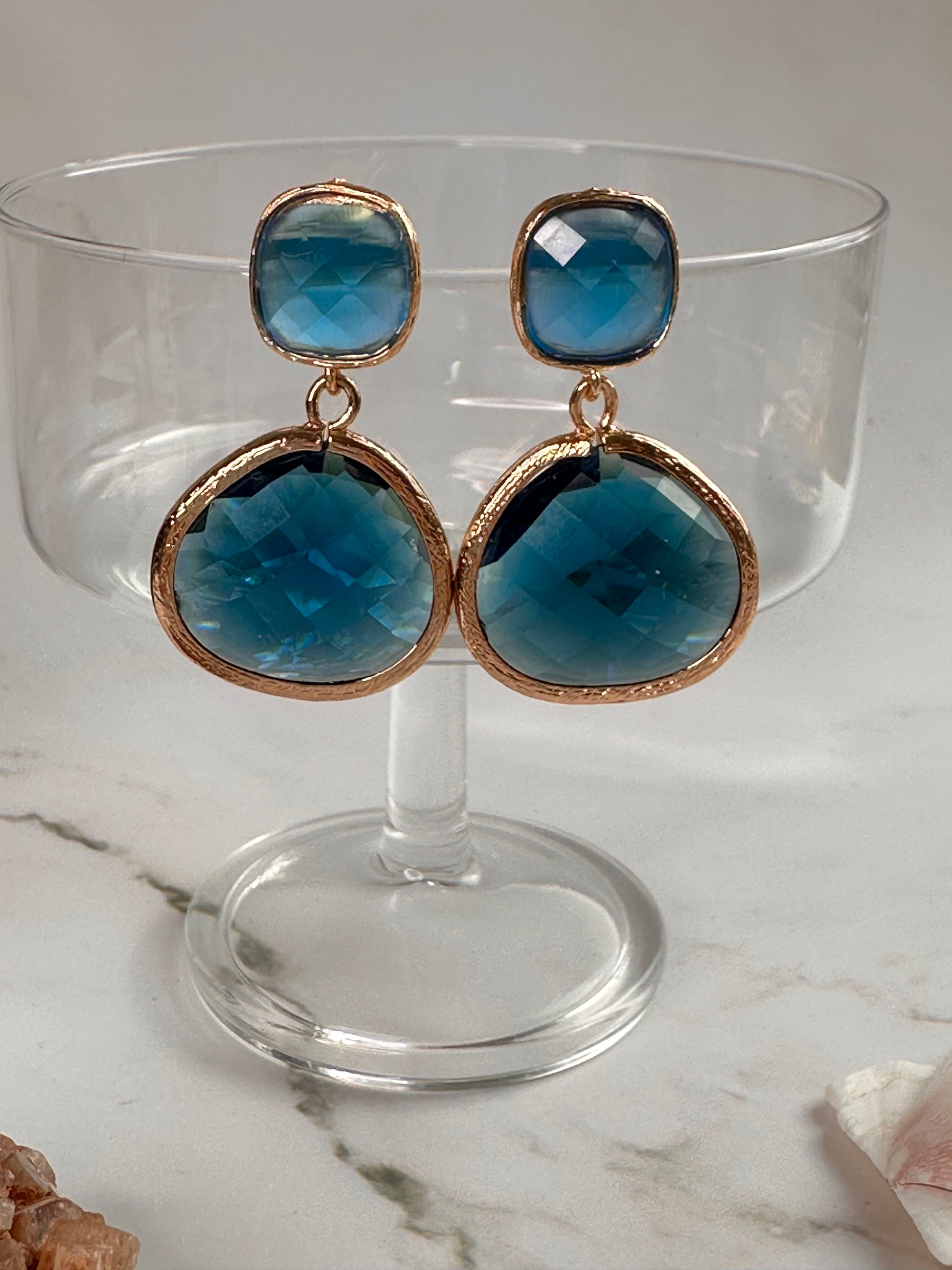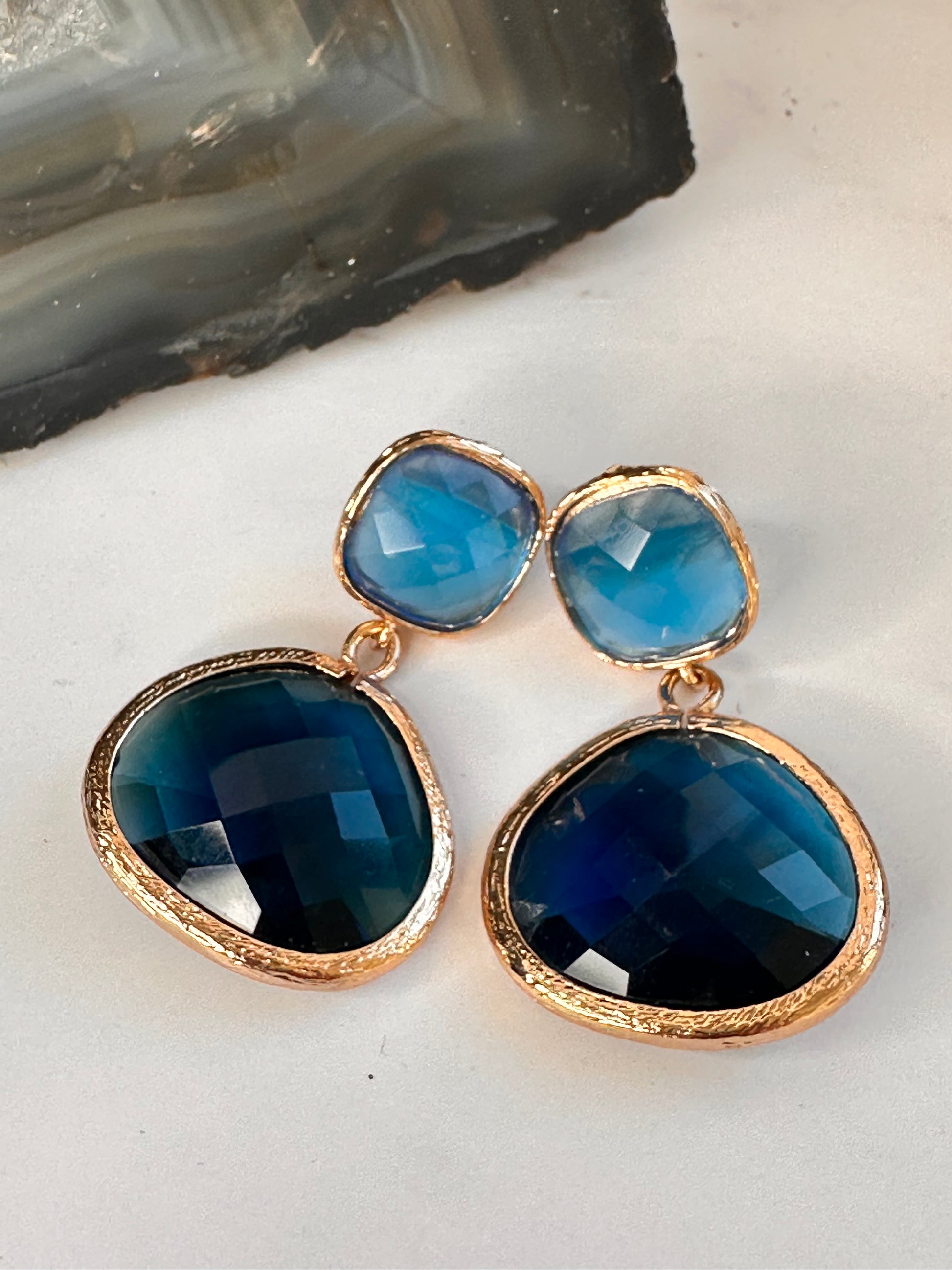 Blue faceted glass earrings. 4 cm in length