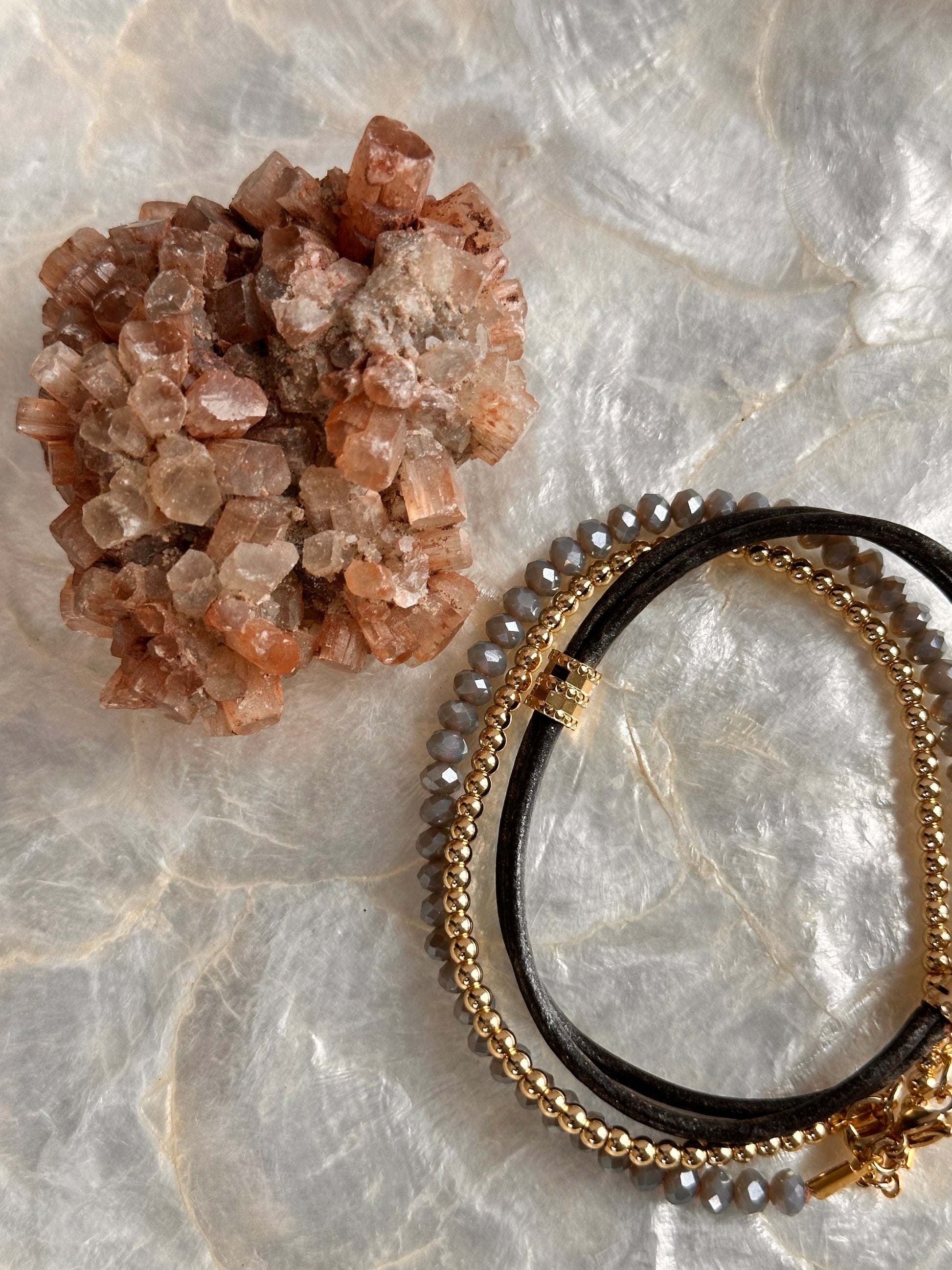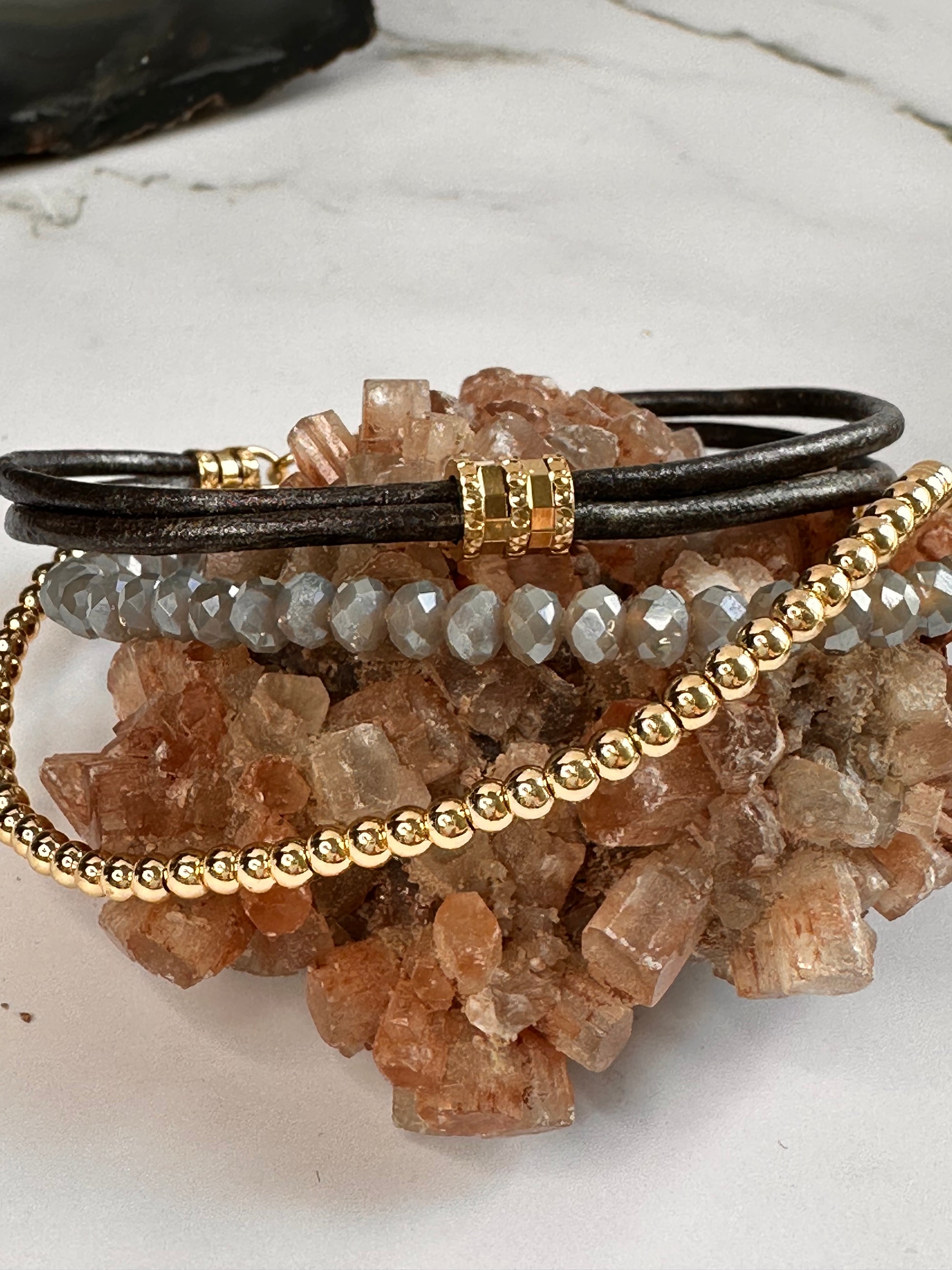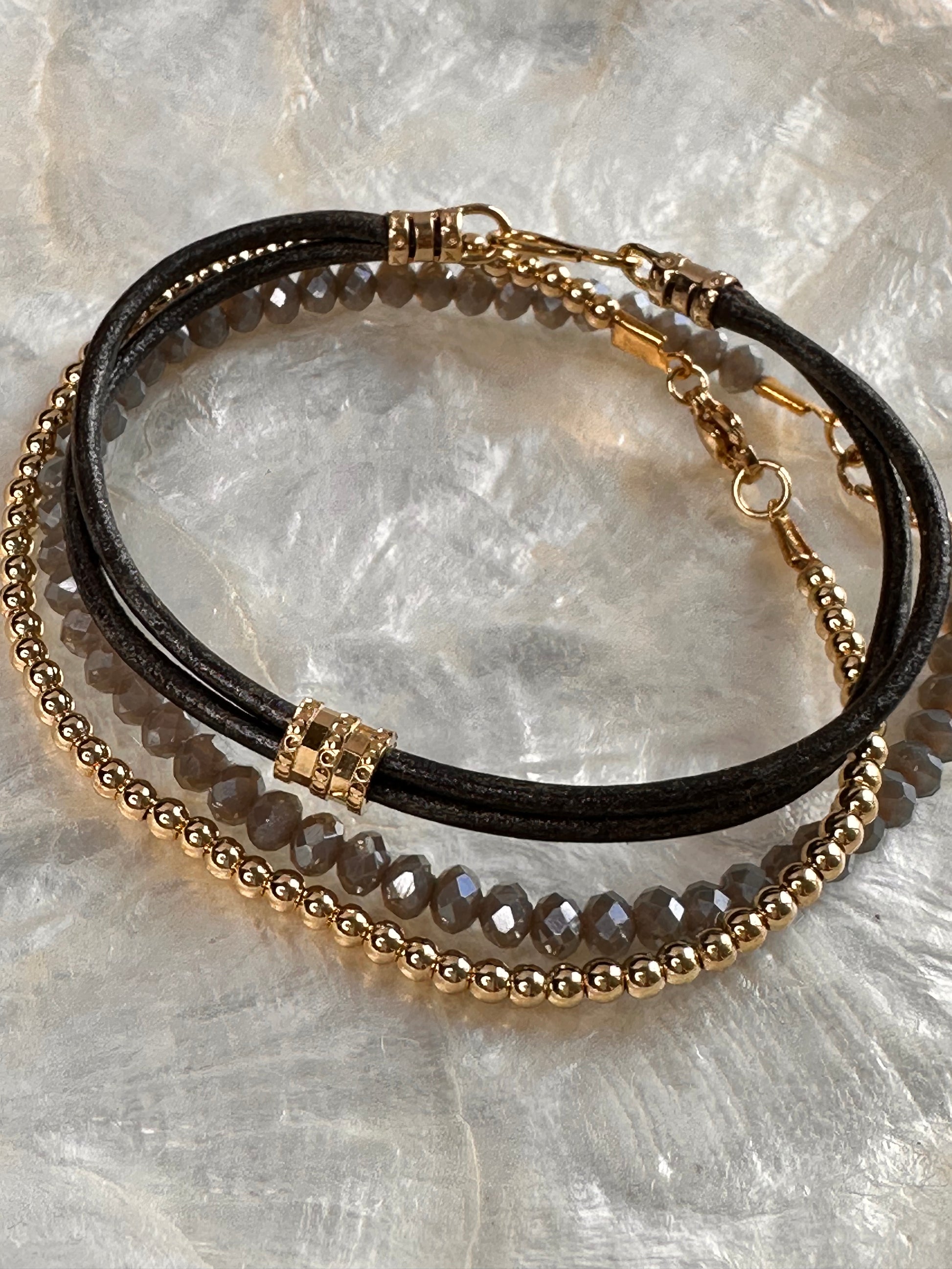 A stack of three bracelets. Grey double leather bracelet with 24 kt gold plated accents, light grey crystal bracelet with a 24 kt gold plated lobster claw clasp and a single bracelet with 18 kt gold plated round beads. Can also be worn separately. 18 cm