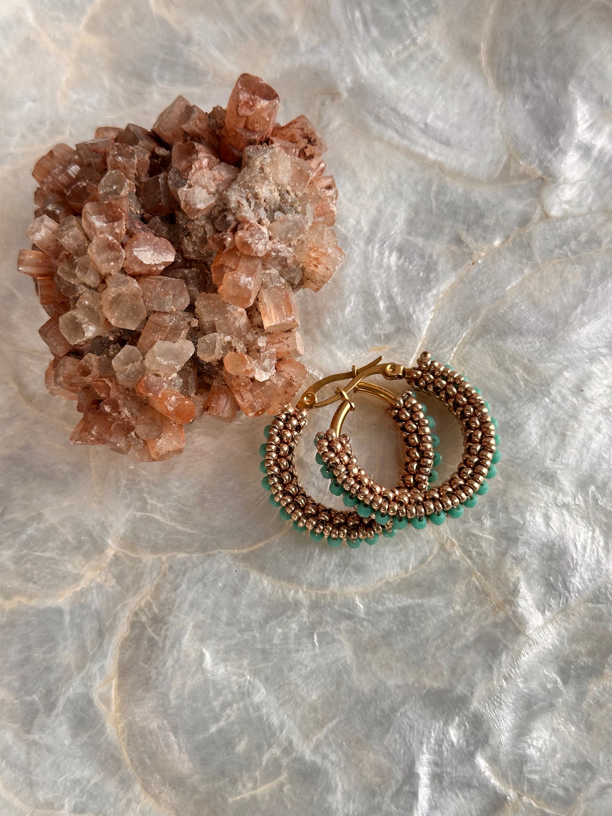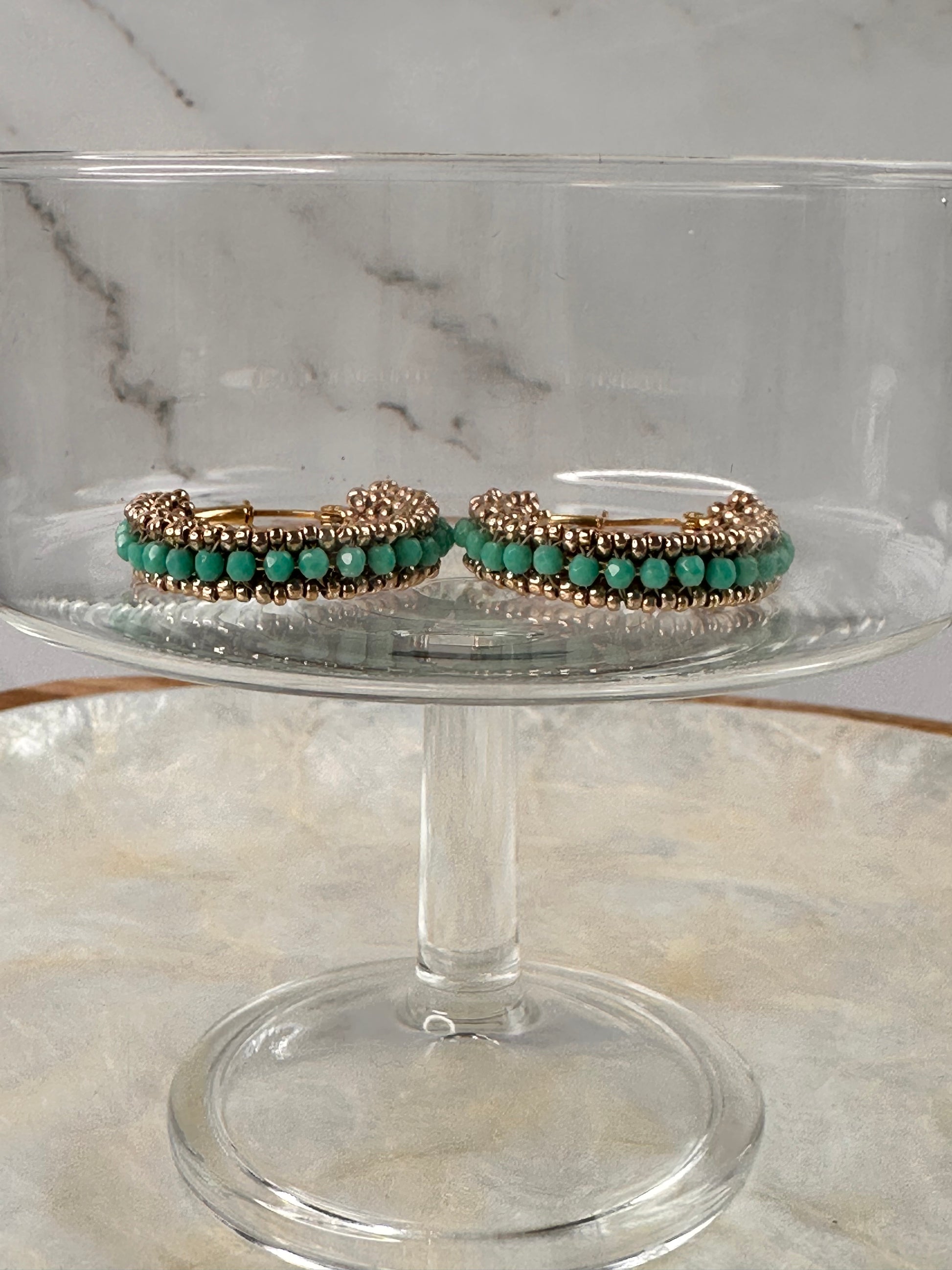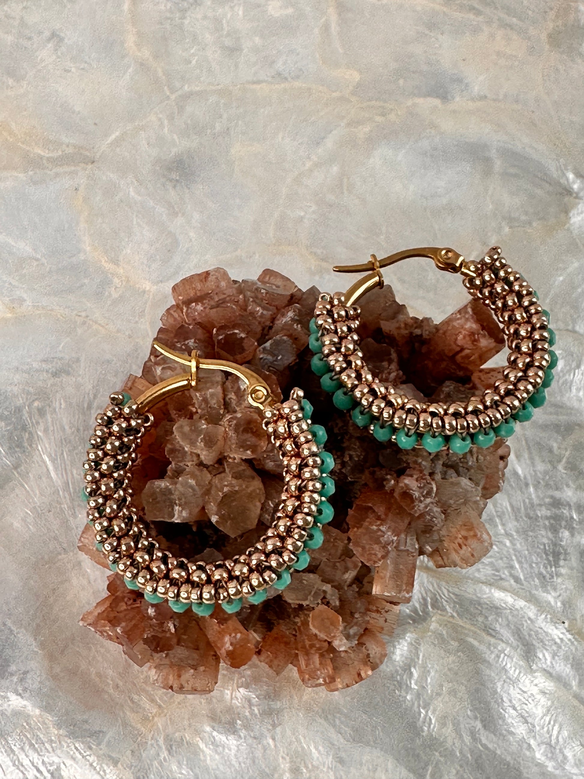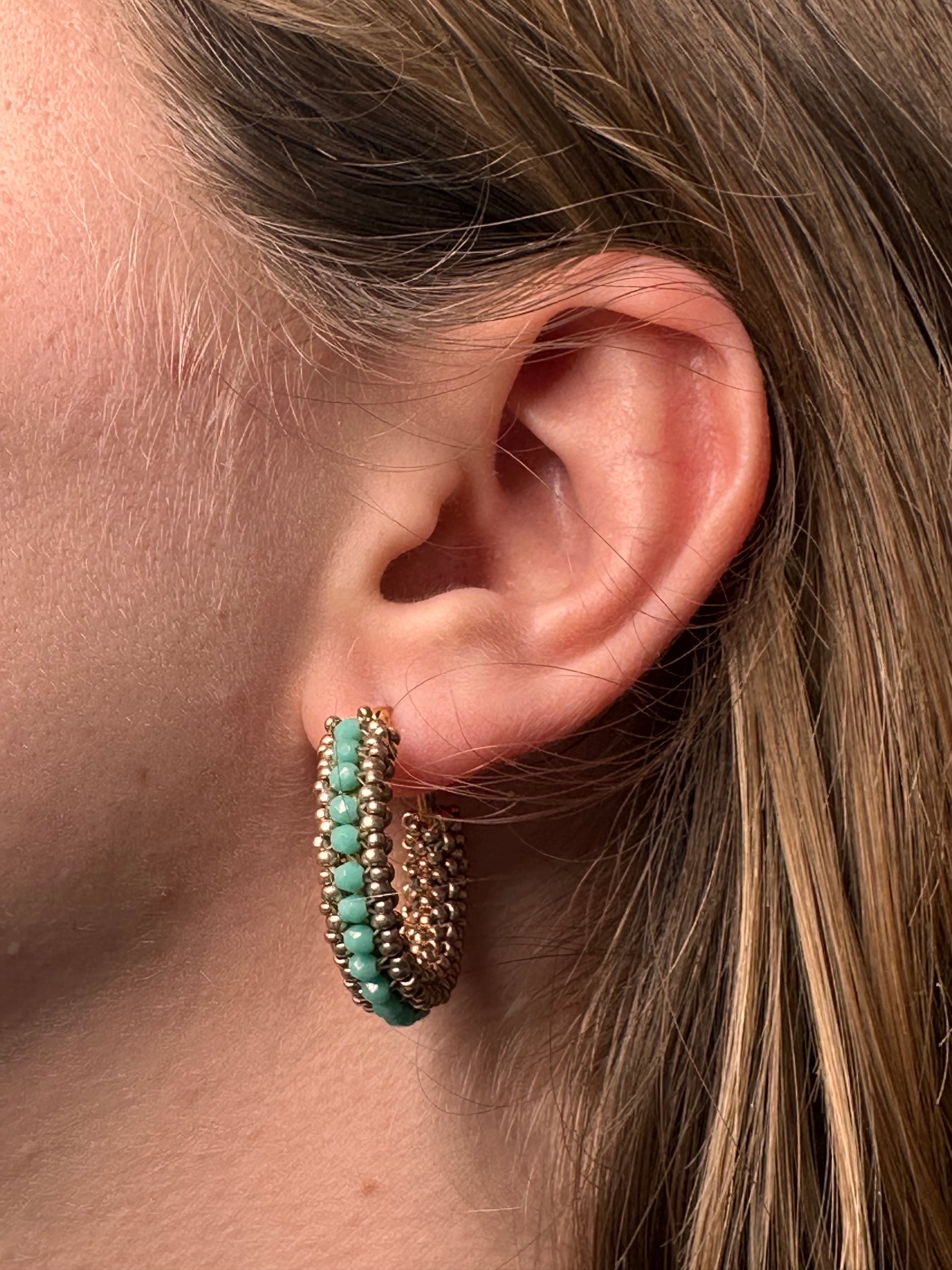 Beaded Miyuki hoops with turquoise firepolished beads. 3 cm in length.