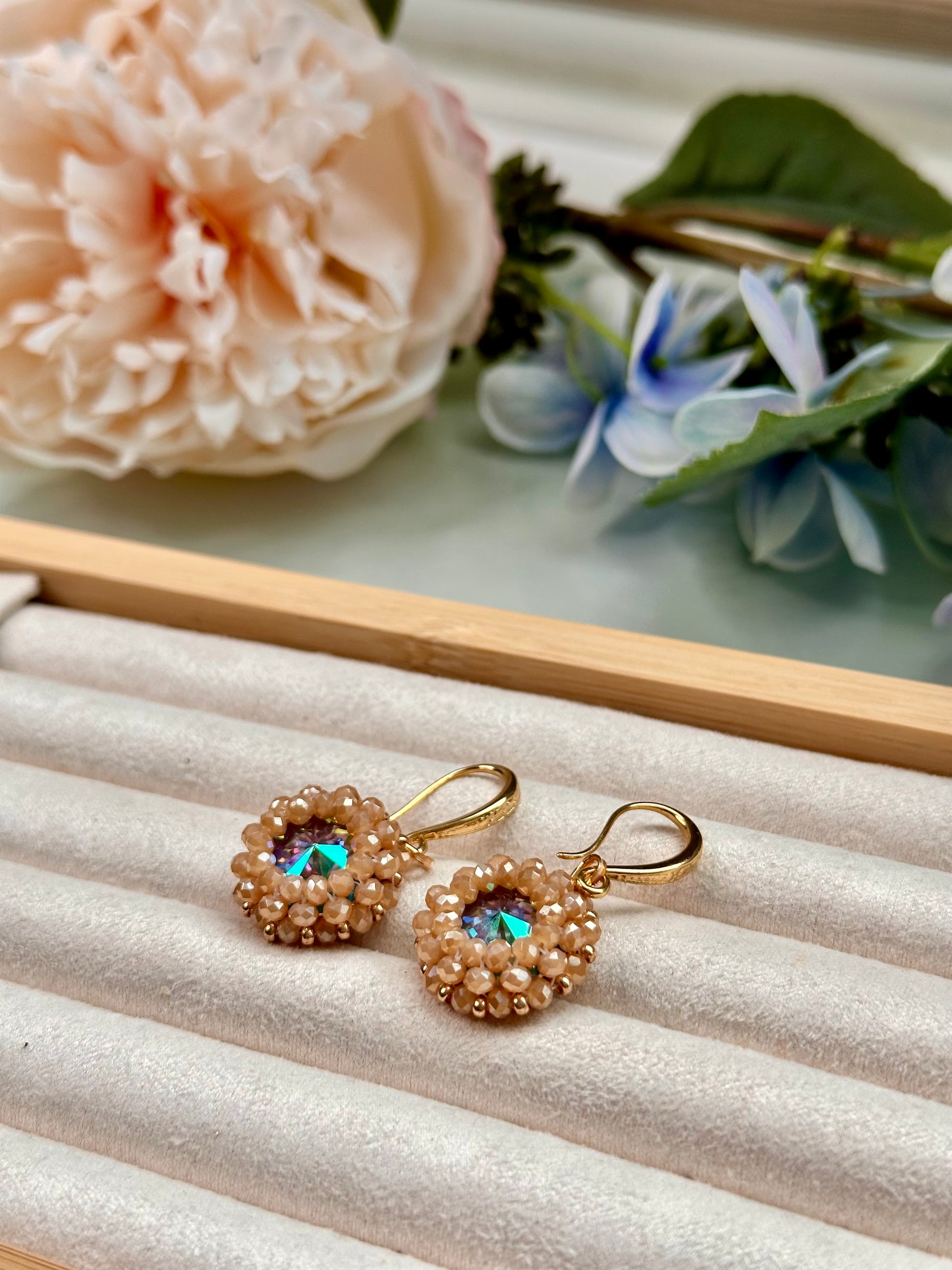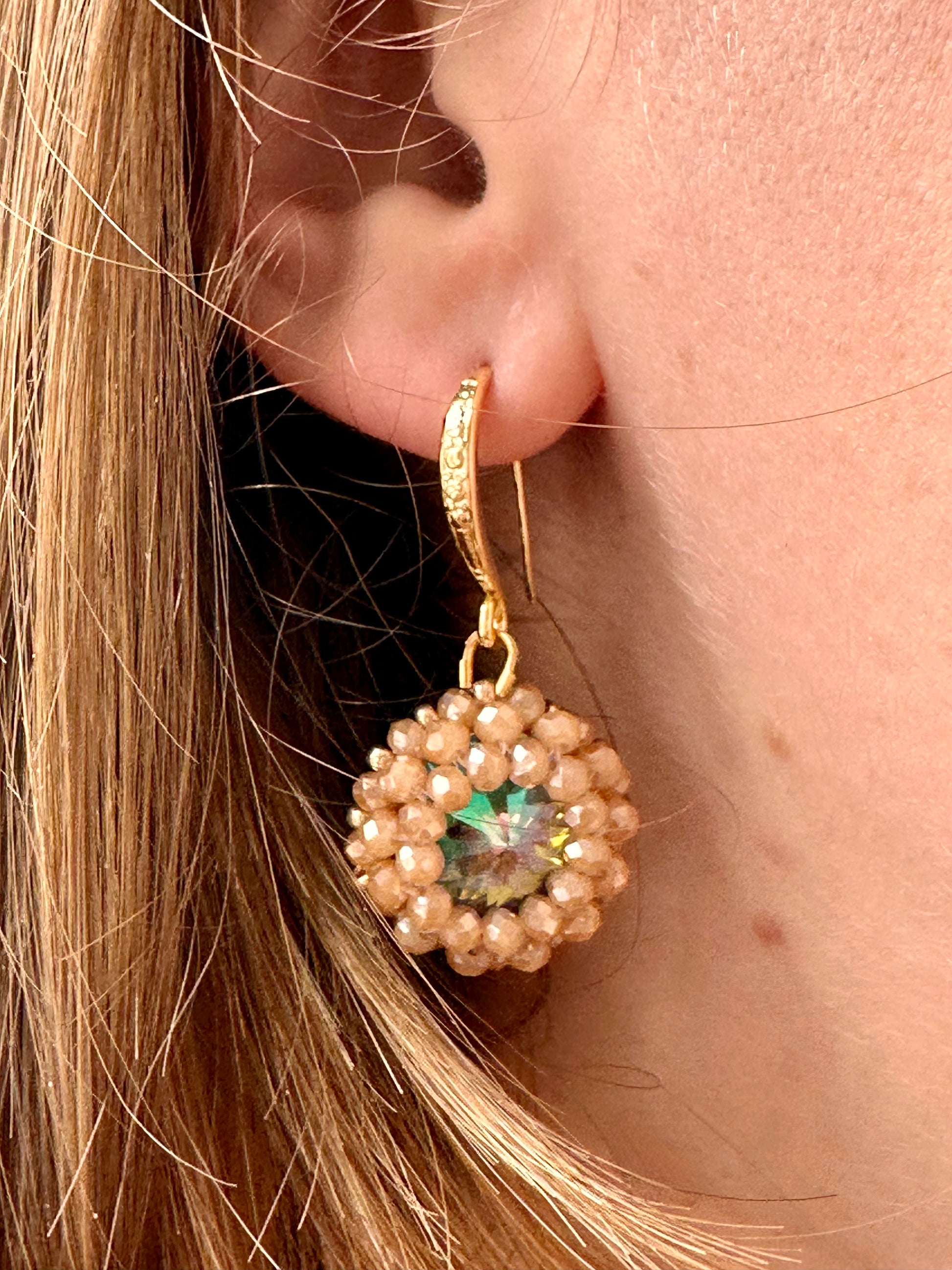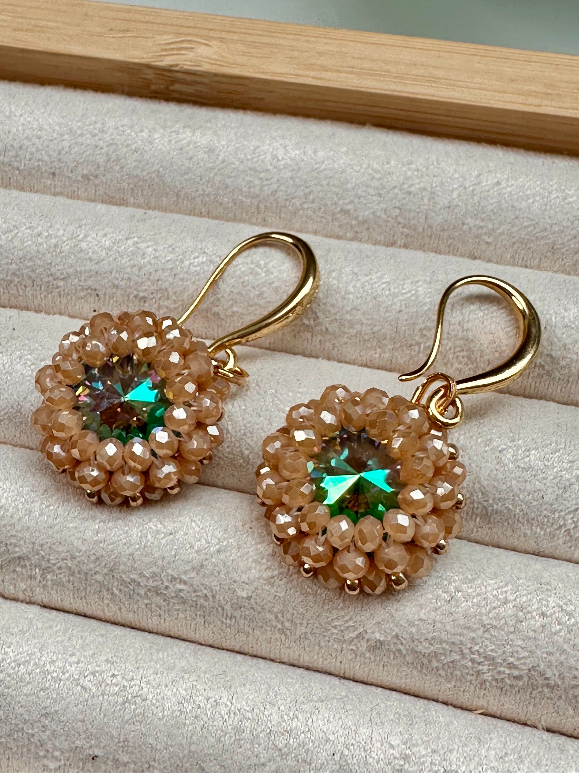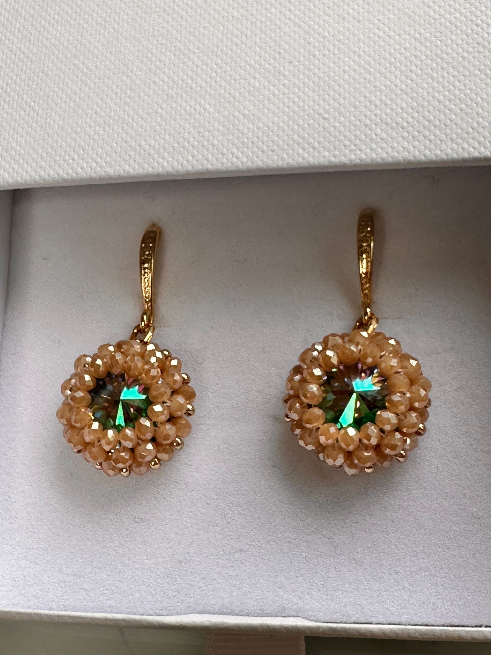 Rainbow Swarowski crystals bezelled with caramel colored crystals. 18 ct gold plated hooks, 4 cm in length