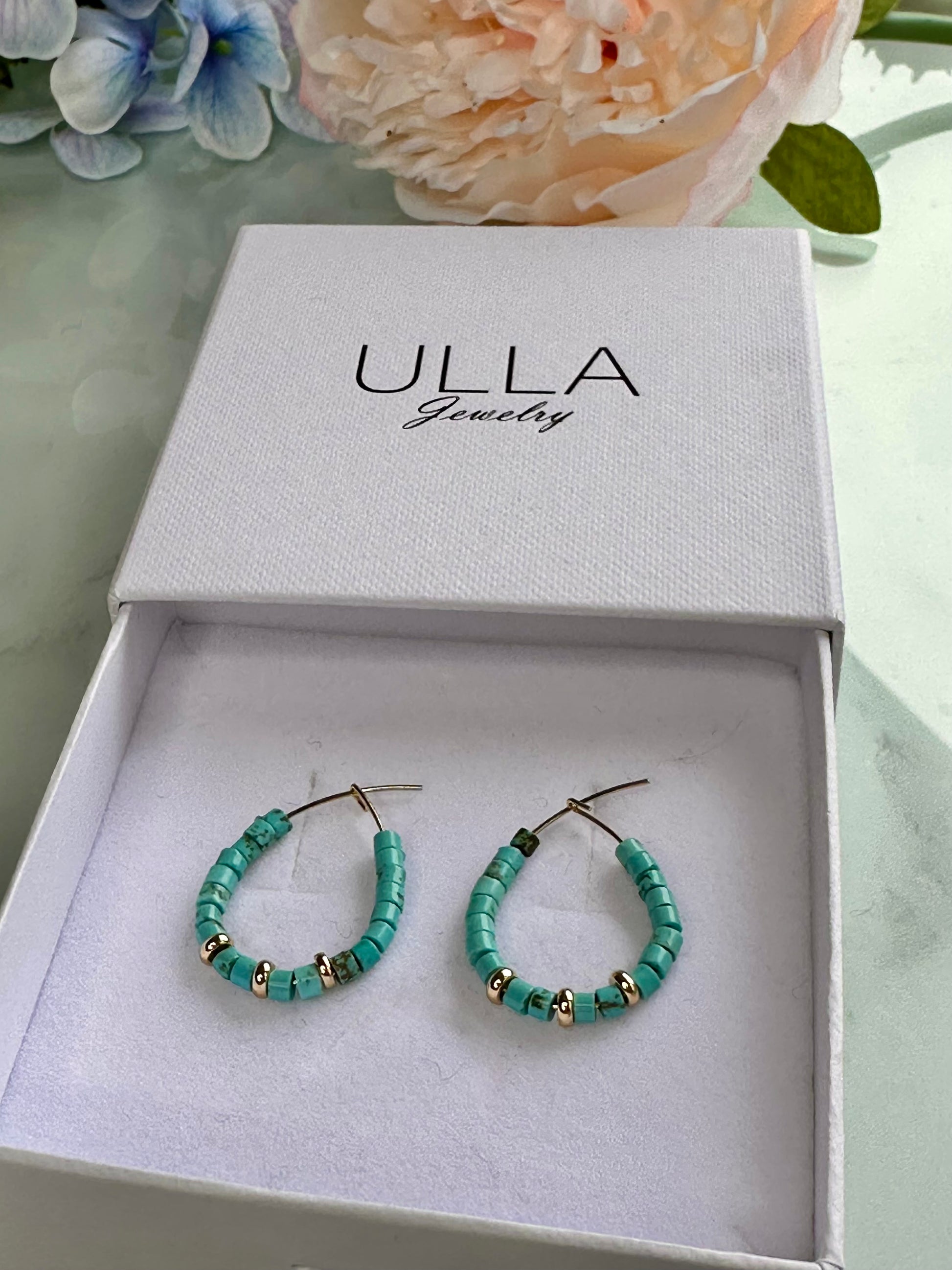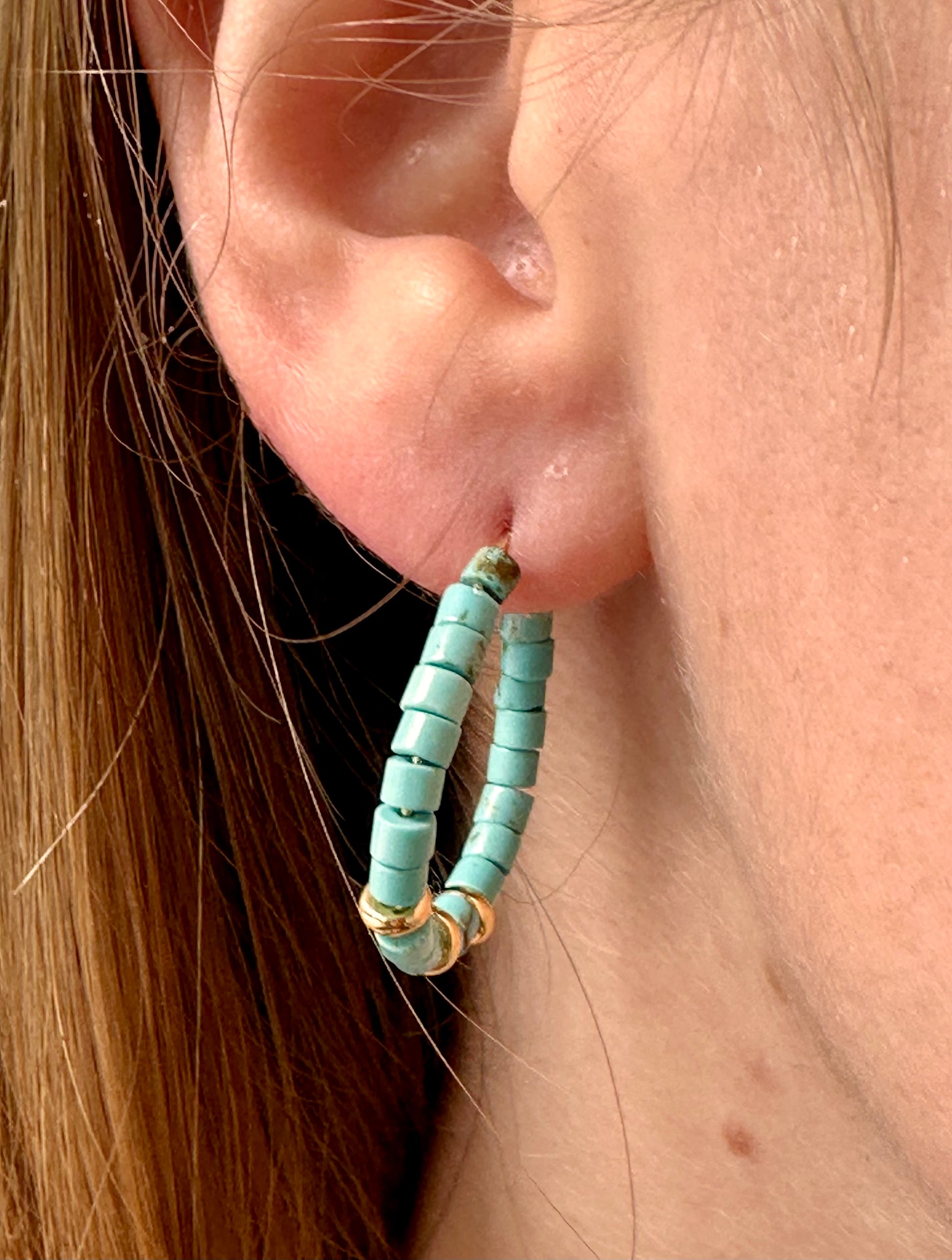 Turquoise heishi bead hoops with gold plated accents. 3 cm in length