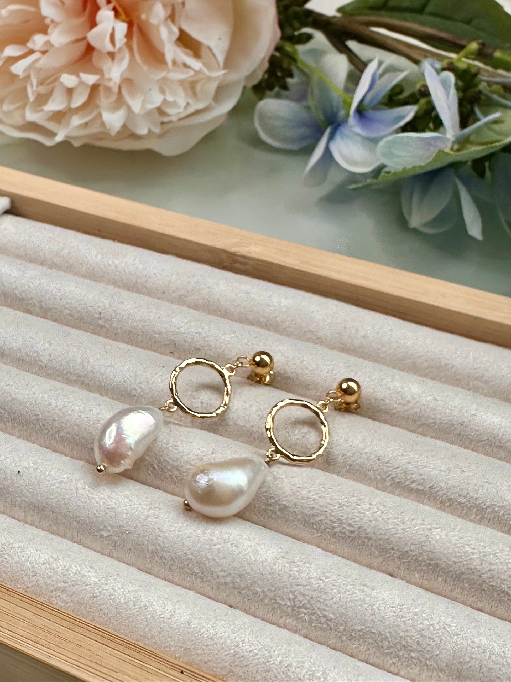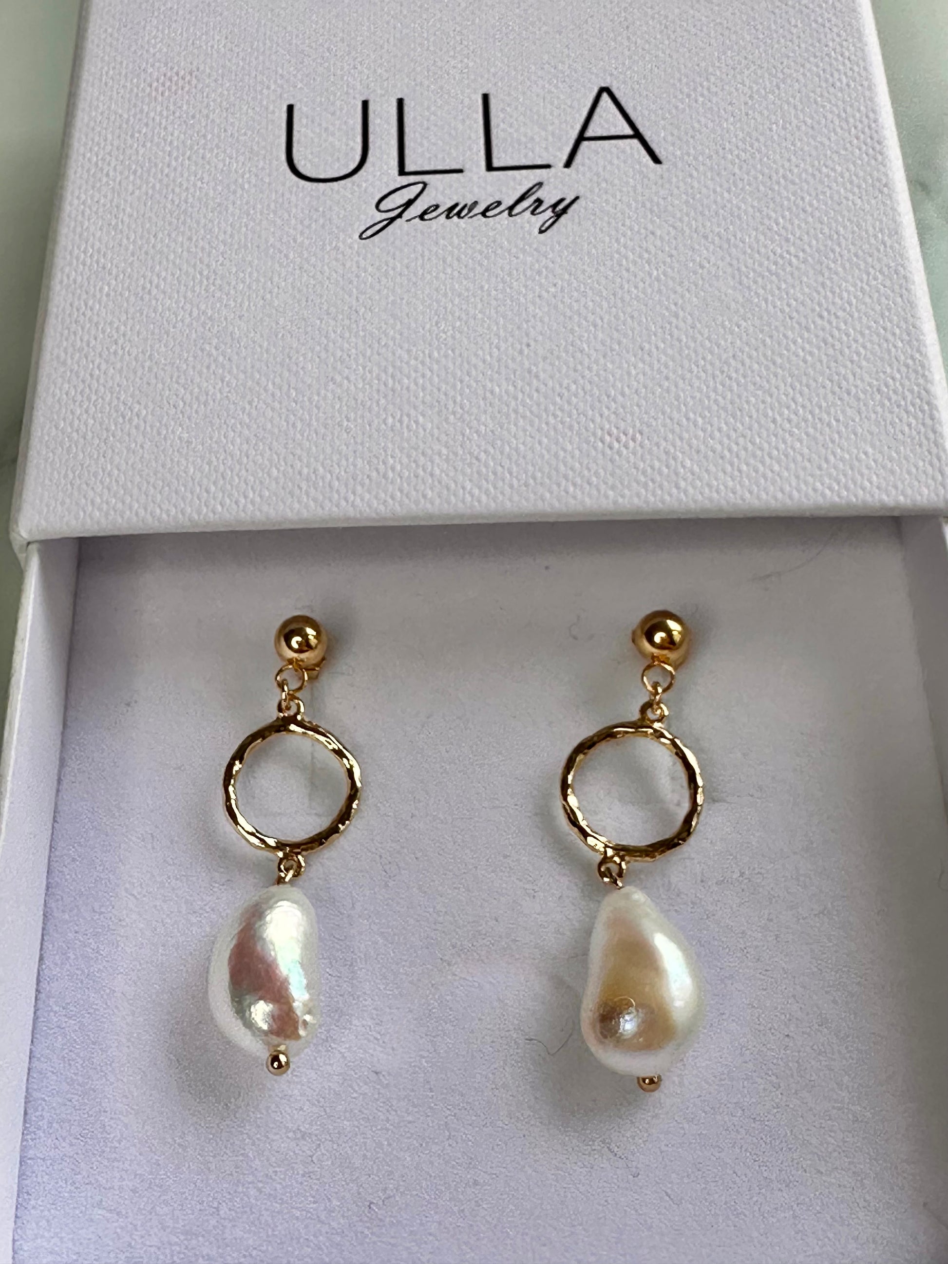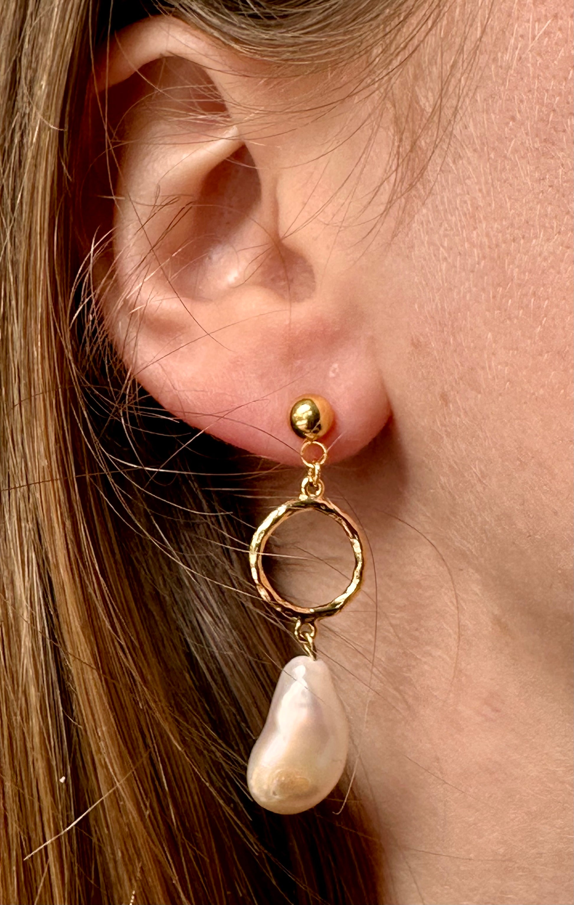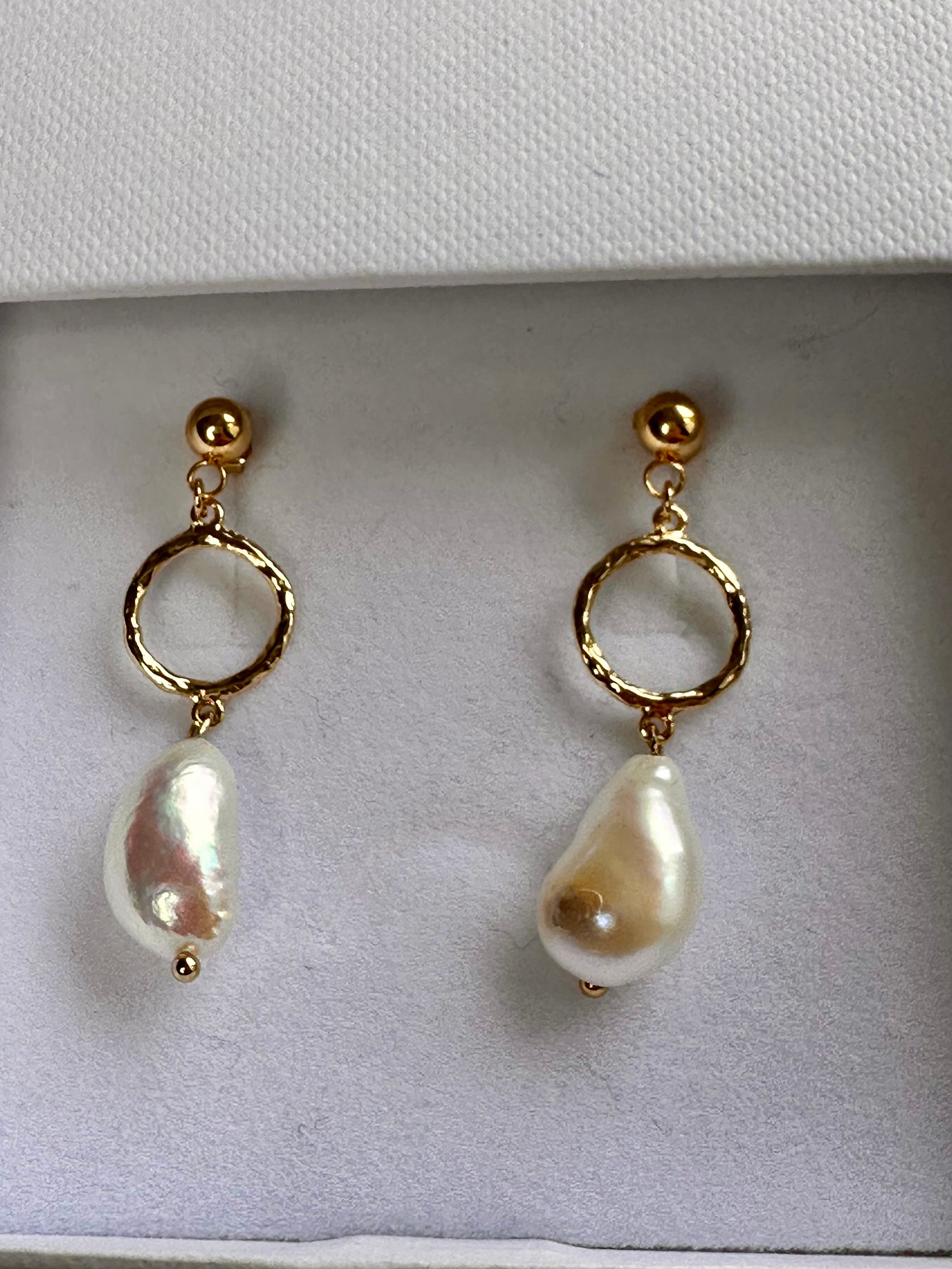 Baroque pearl earrings with a circular gold plated link. Gold plated studs. 4cm in length