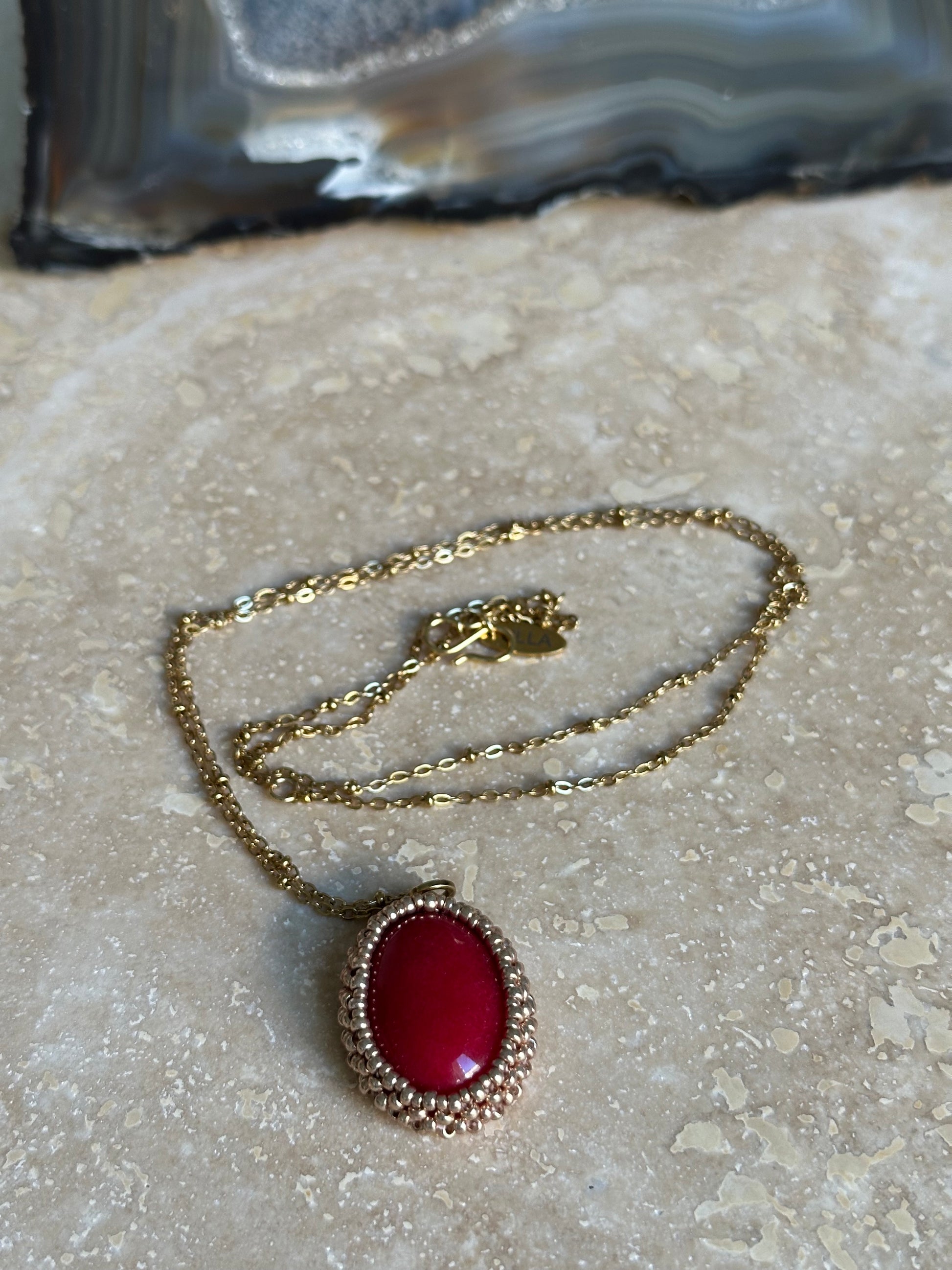 Red Agate Gemstone Pendant, 3cm in length, Stainless steel 18ct gold plated chain that can be worn at 70 cm and 80 length.