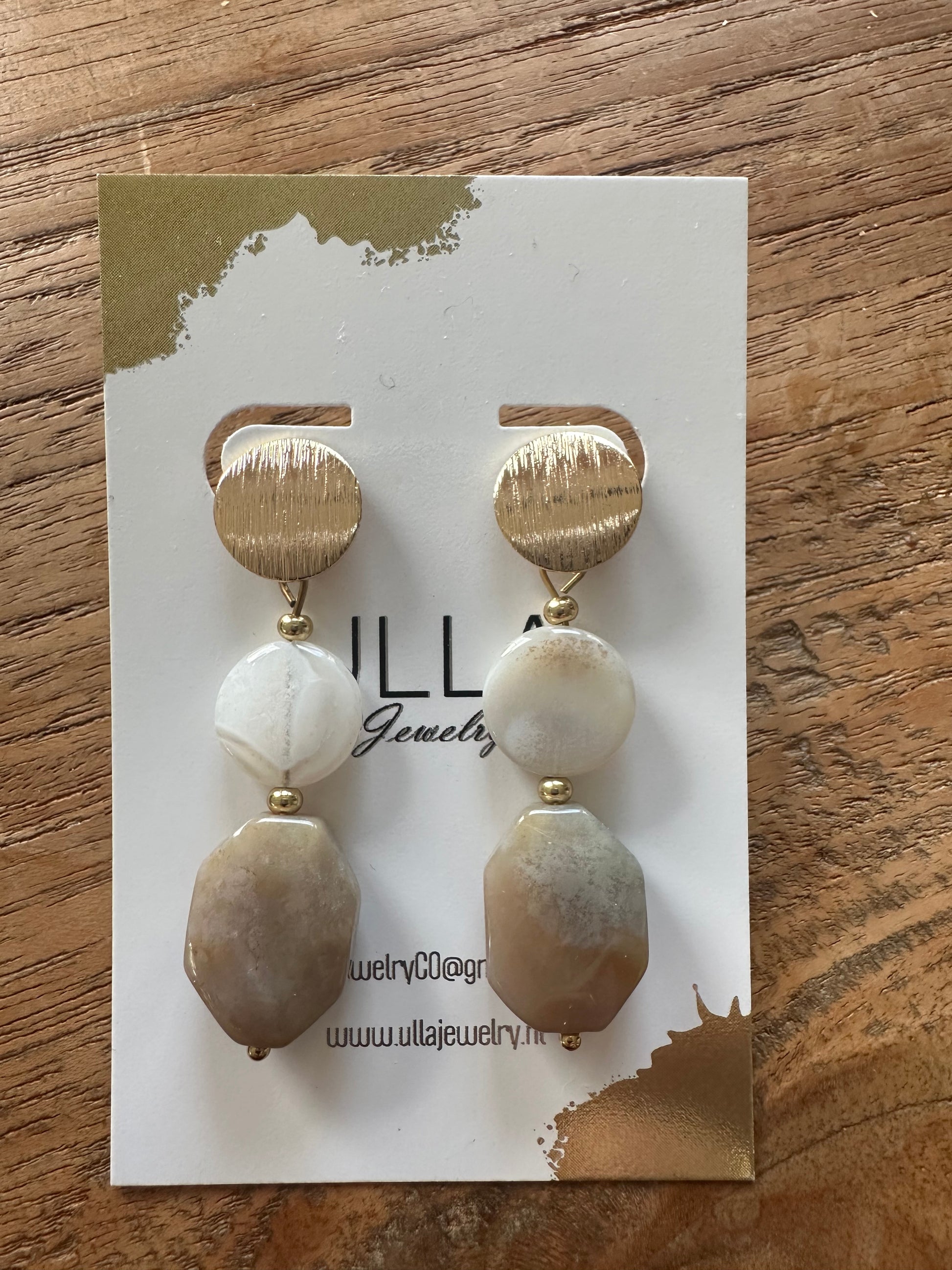 Taupe colored Agate Earrings, with a gold plated stud, 5 cm in length