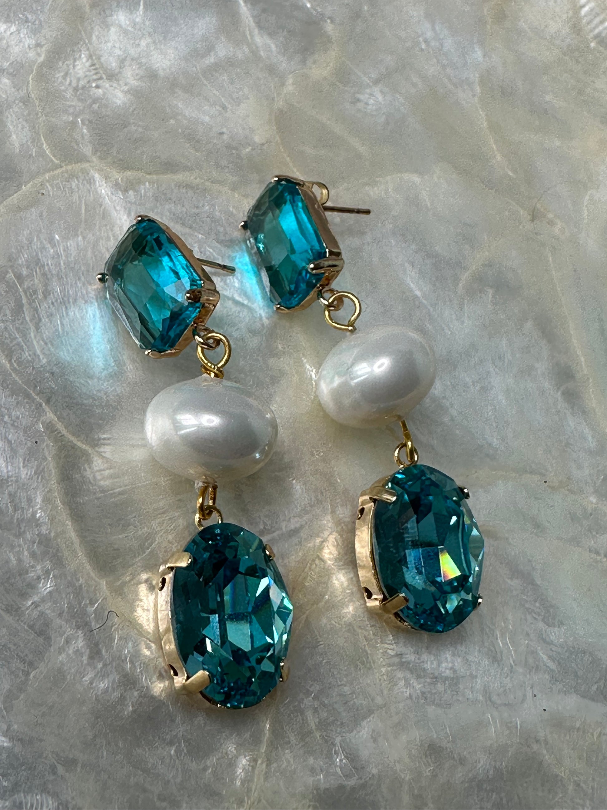Turquoise crystals and disc shaped shell pearls, 5 cm in length. Model image created with AI