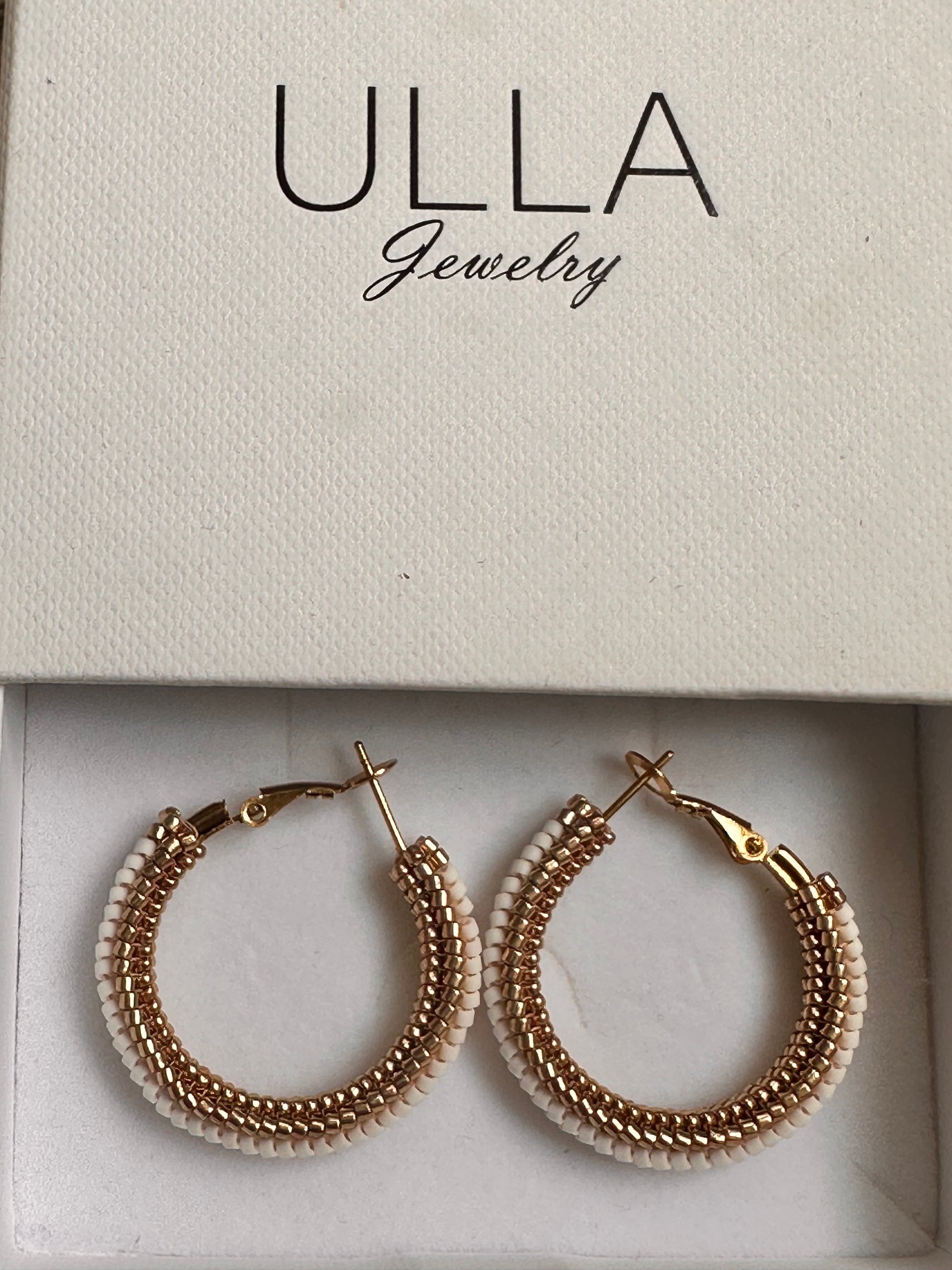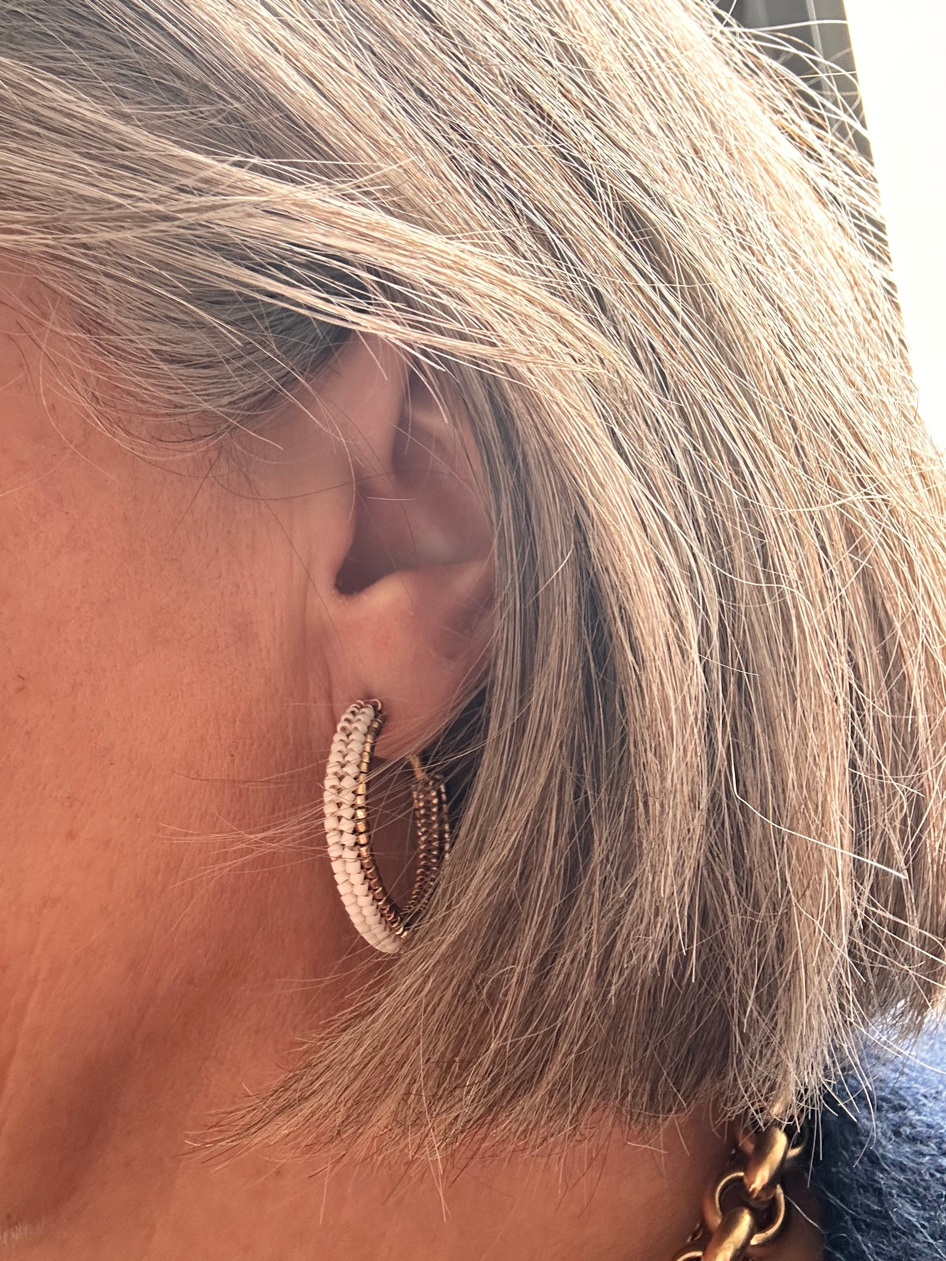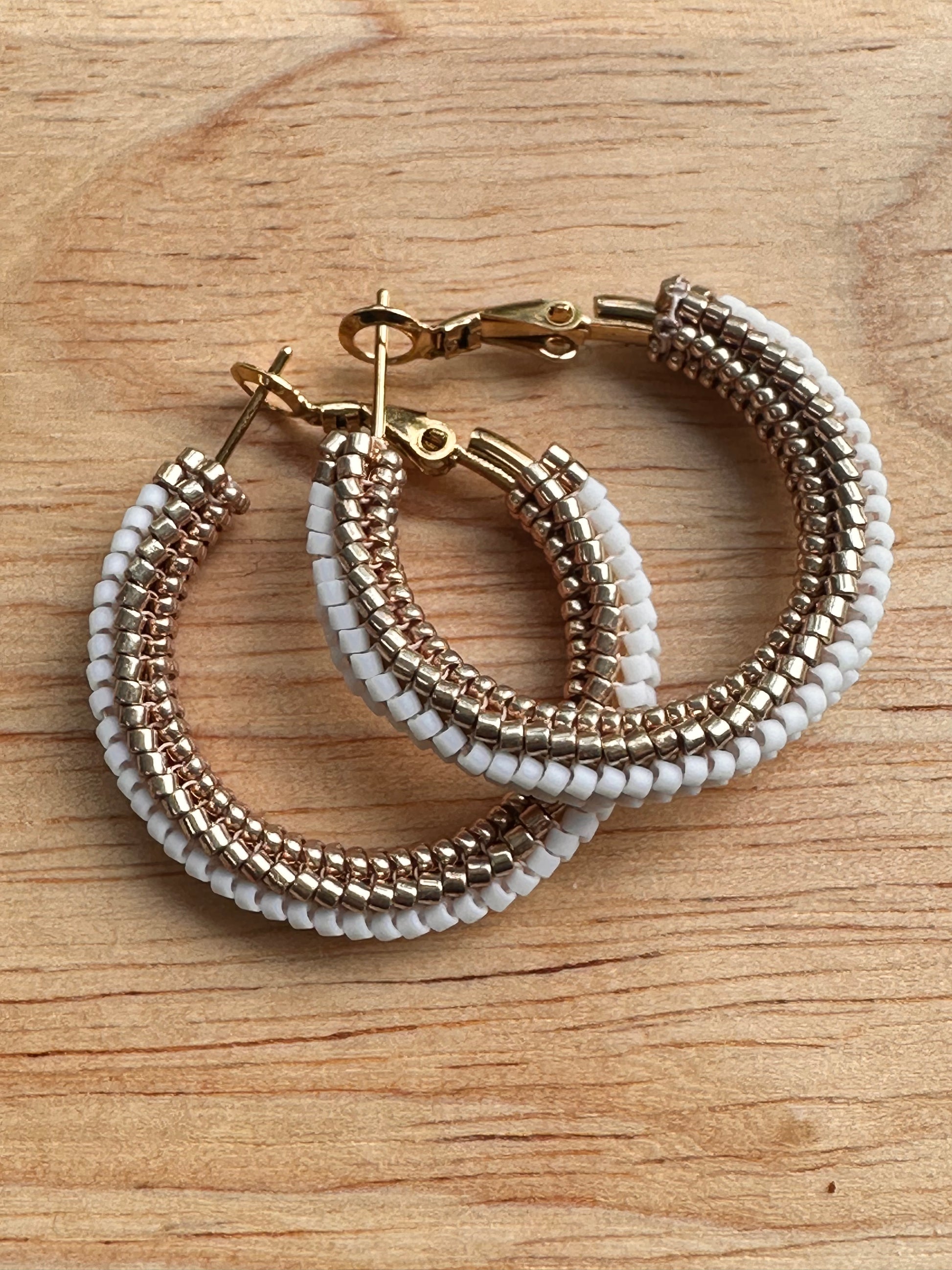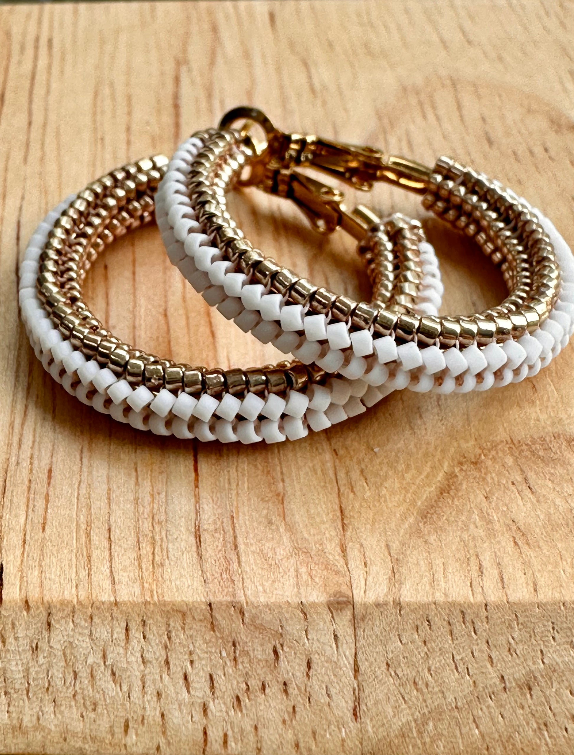 Stainless Steel Hoops with Miyuki Delica Beads in Herringbone Weave. 3 cm in length. Matte White